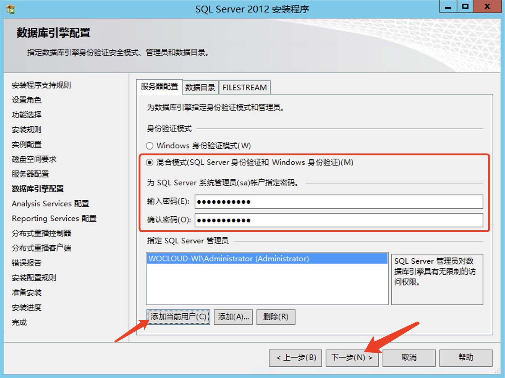 混合模式”,设置sa账户密码。单击“添加当前用户”,将当前用户指定为SQL Server管理员,单击“下一步”