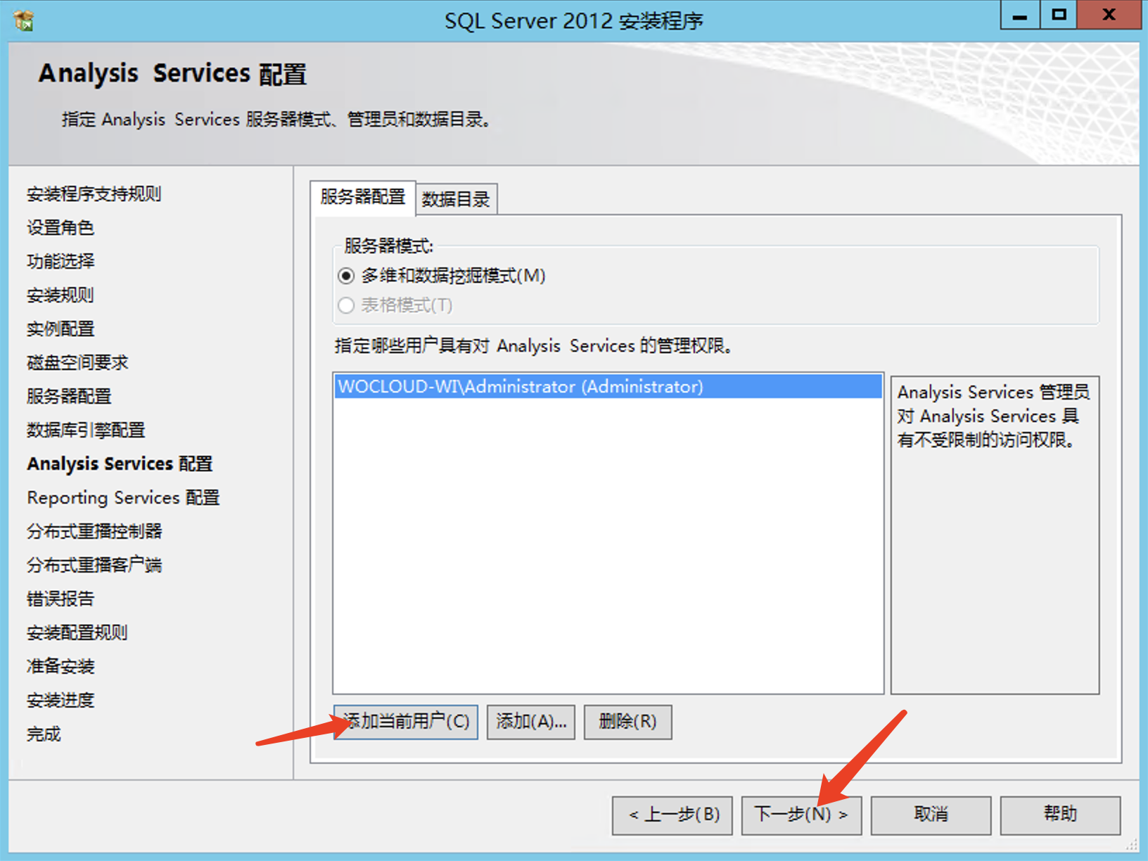 添加当前用户”,指定当前用户具有对Analysis Services的管理权限,单击“下一步”