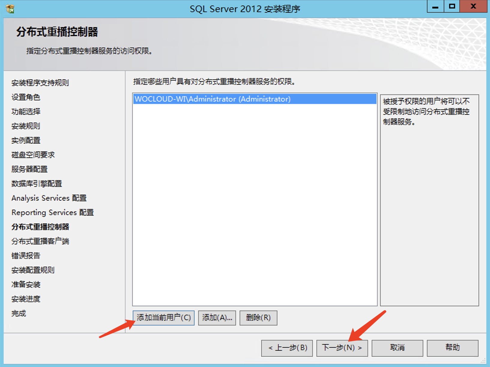 添加当前用户”,指定当前用户具有对分布式重播控制器服务的权限,单击“下一步”