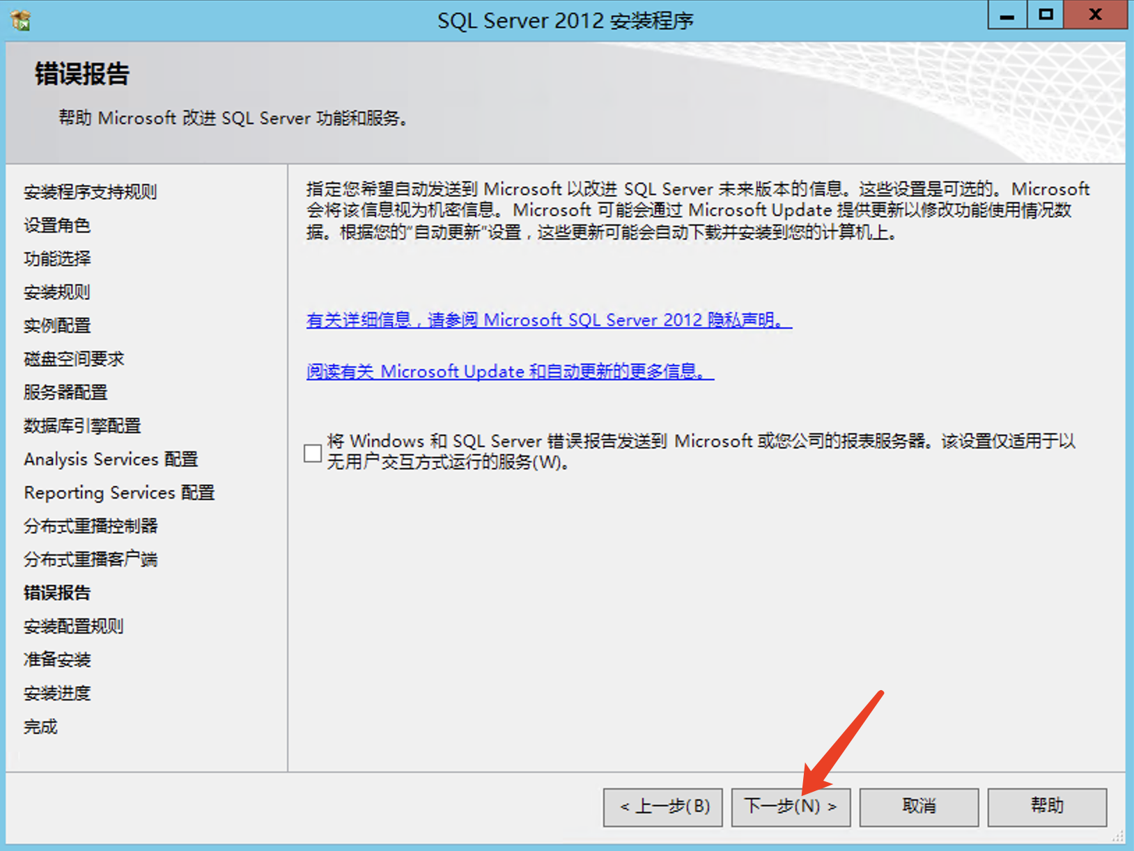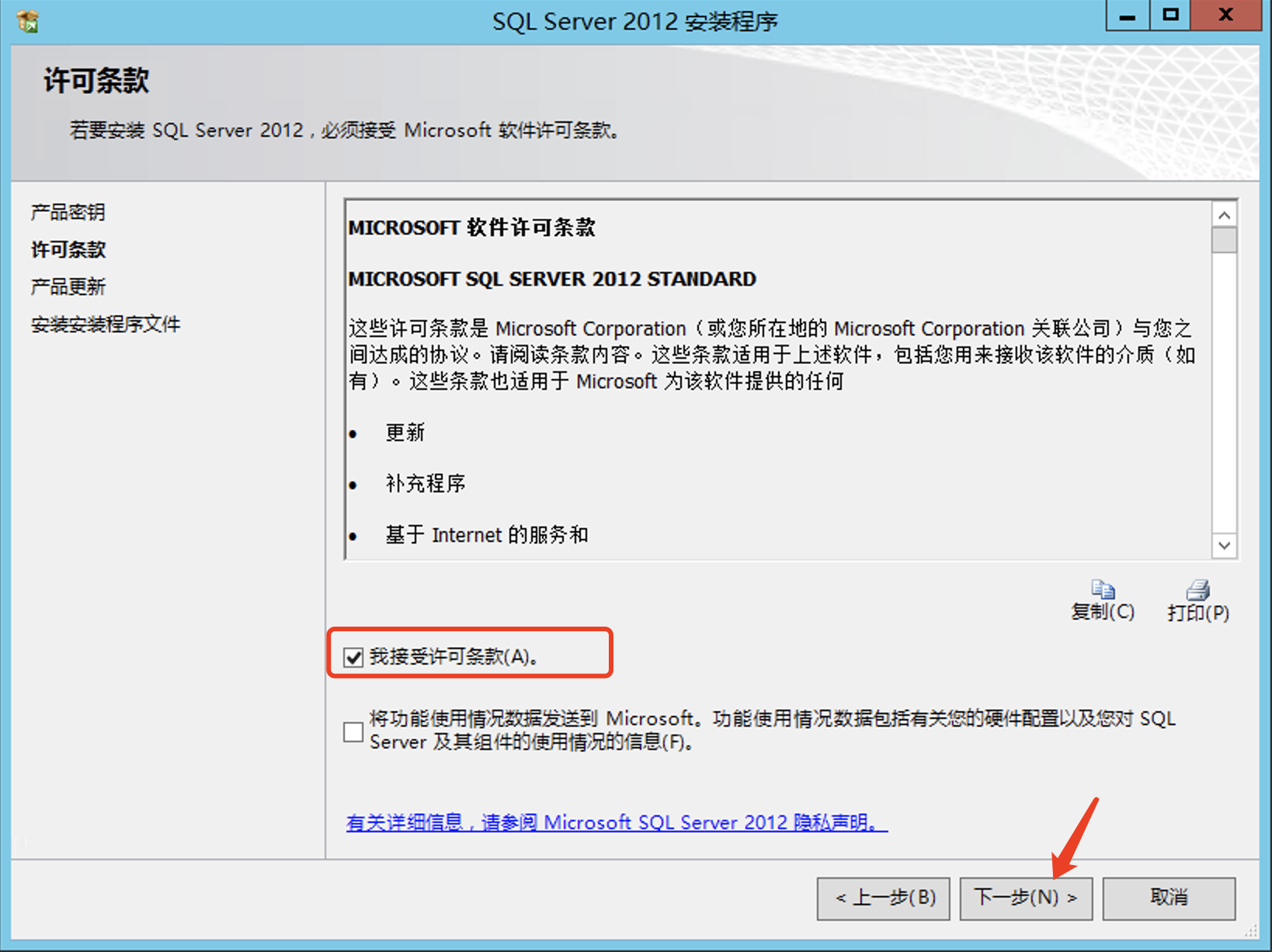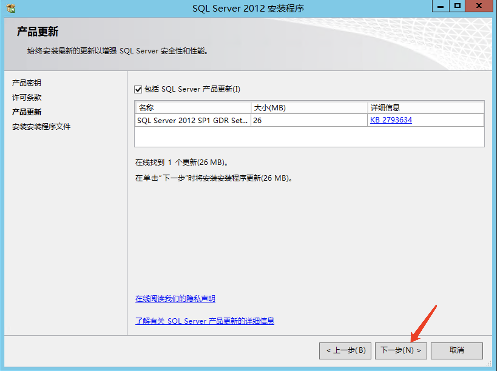 - 系统检测是否有SQL Server产品更新,若有,在单击“