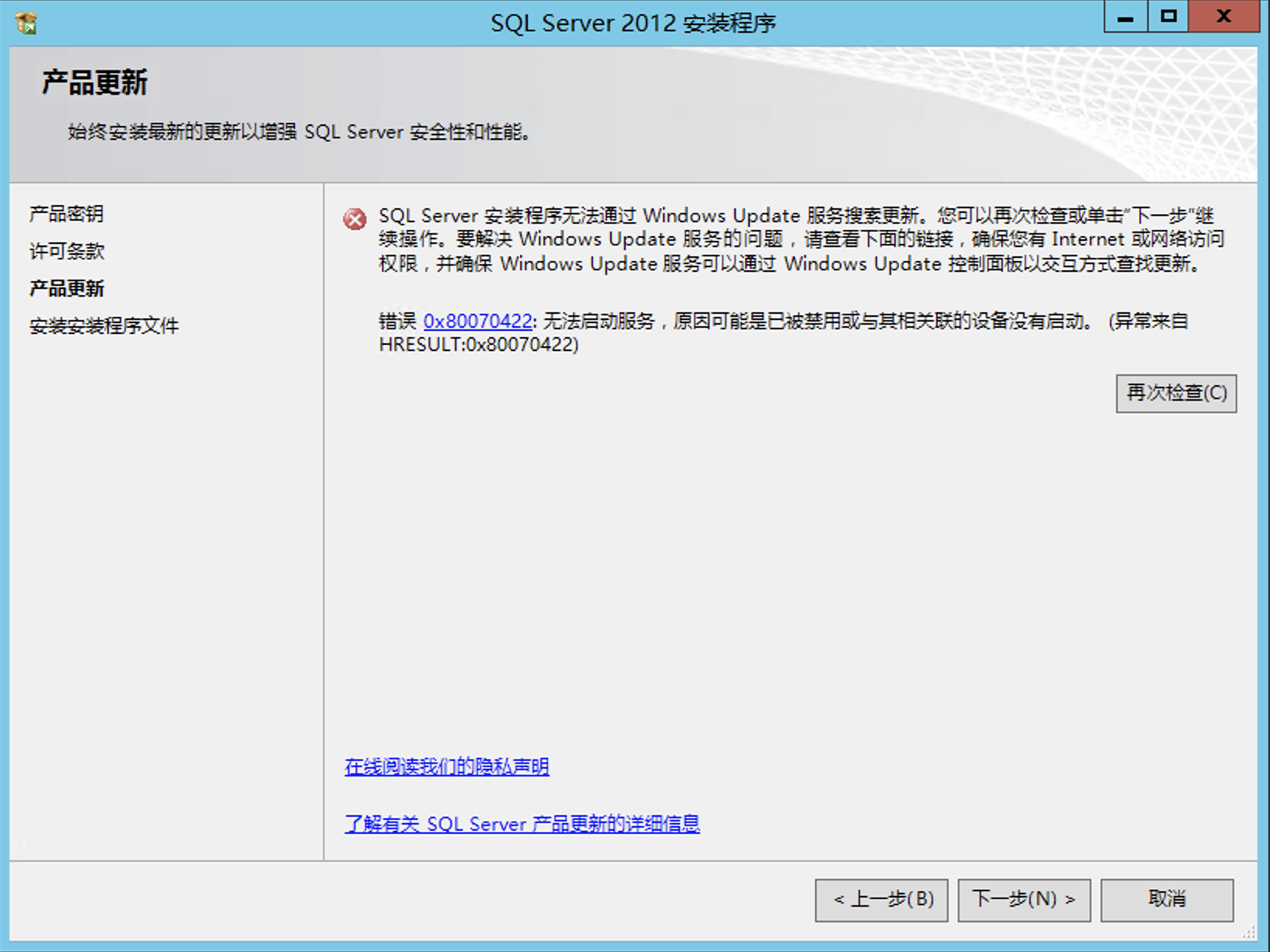 产品更新检查失败,提示“SQL Server安装程序无法通过Windows Update服务搜索更新....错误 0x80070422:无法启动服务,原因可能是已被禁用或与其相关联的设备没有启动。(异常来自 HRESULT:0x80070422)”