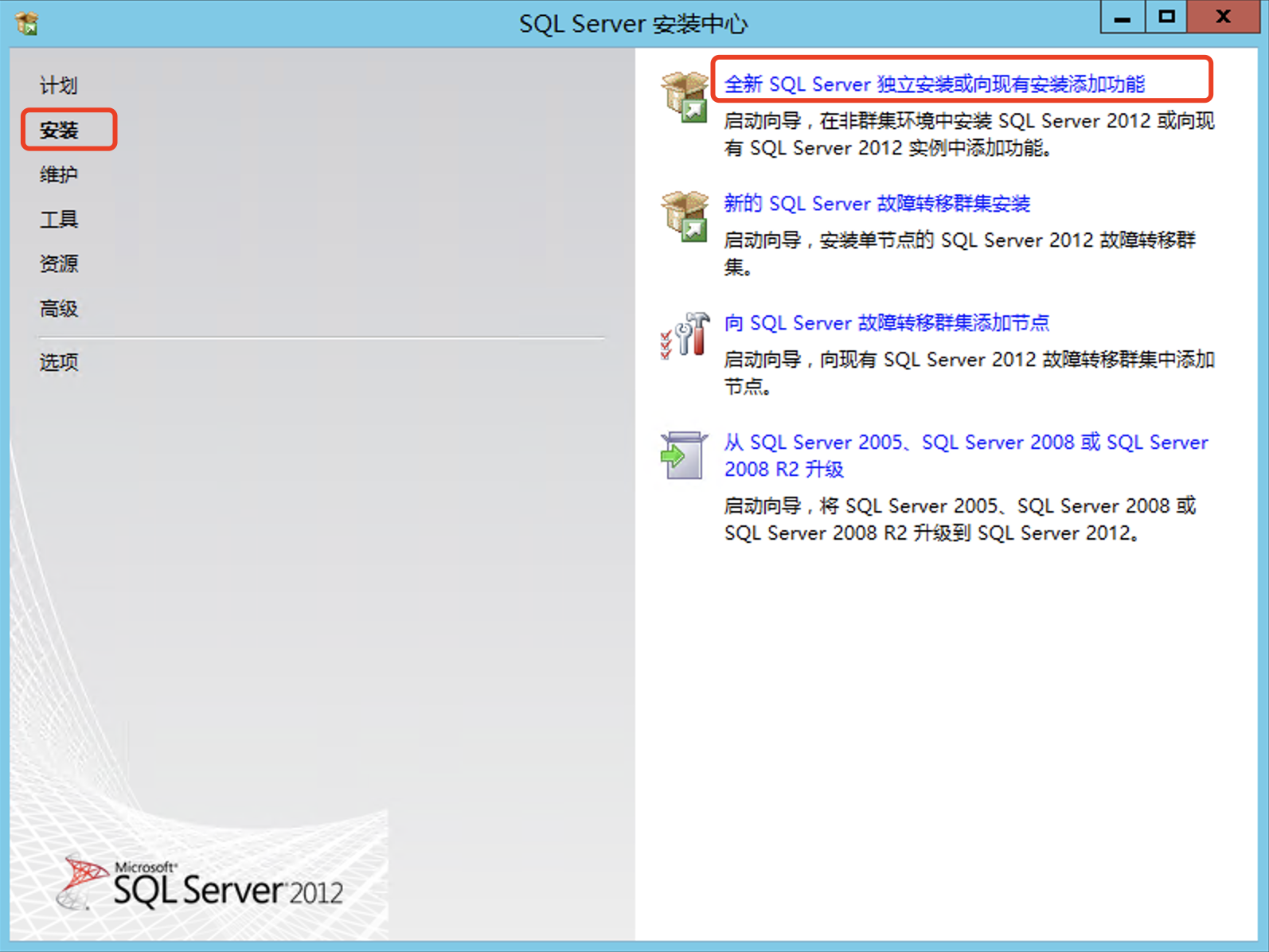 - 进入SQL Server安装中心,单击左侧项目中的“