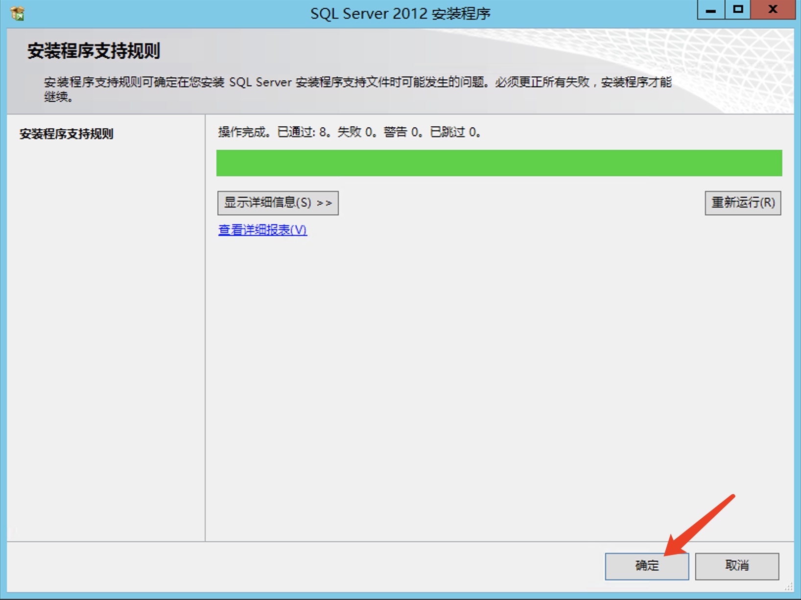 - 系统检测安装程序所需要的所有支持规则,全部通过后单击“