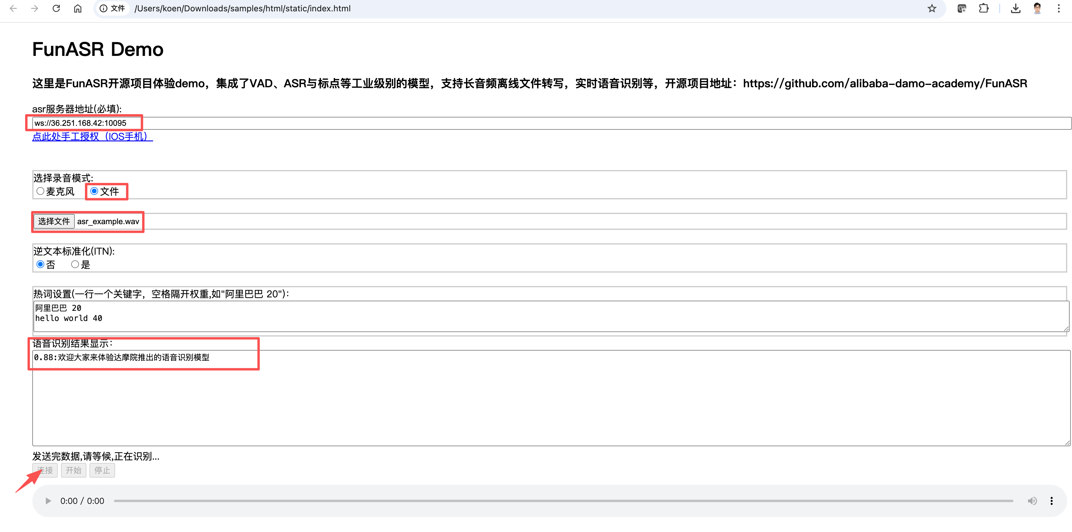 下载测试工具并解压,在浏览器中打开samples/html/static/index.html,出现如下页面。“asr服务器地址”填写“ws://<IP>:<Port>/”(本文为“ws://36.251.168.42:10095/”),“录音模式”选择“文件”,点击“选择文件”上传工具包中的测试音频(samples/audio),最后点击“连接”进行体验