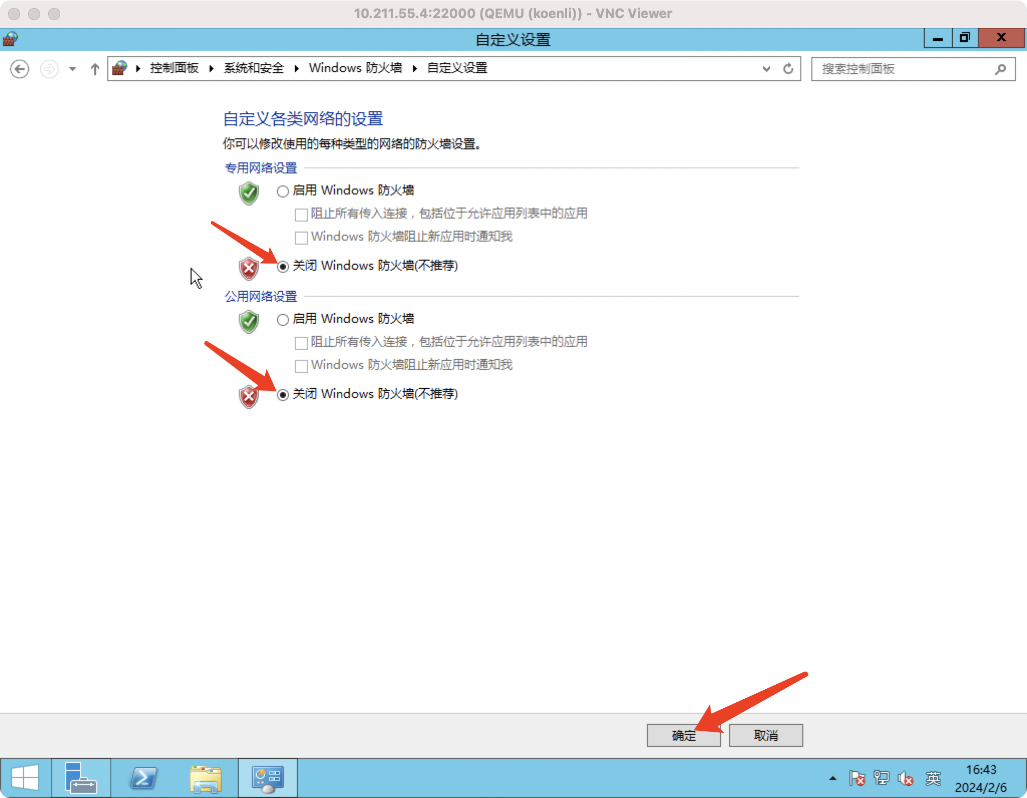 勾选“专用网络设置”和“公用网络设置”的“关闭Windows防火墙(不推荐)”选项,单击“确定”