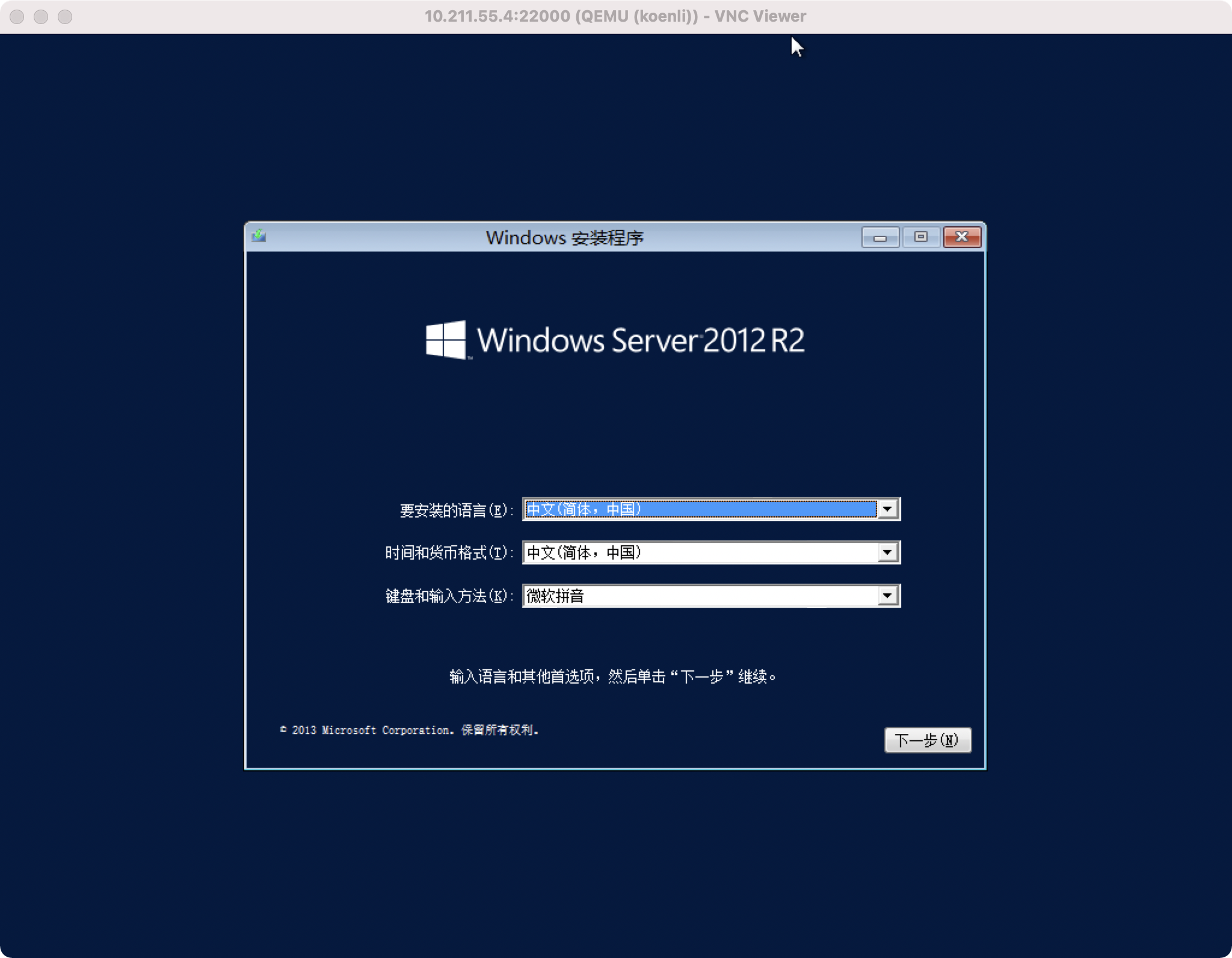 进入虚拟机控制台可以看到虚拟机正在加载文件,加载完成后选择语言,单击“下一步”,接着单击“现在安装”