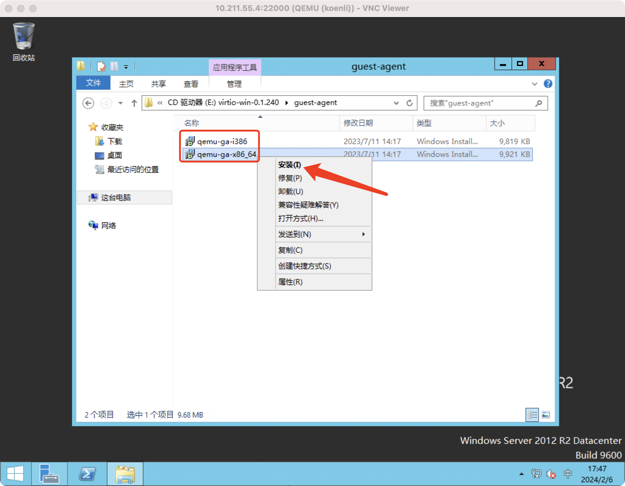 qemu-ga-i386为32位安装包,qemu-ga-x86_64为64位安装包