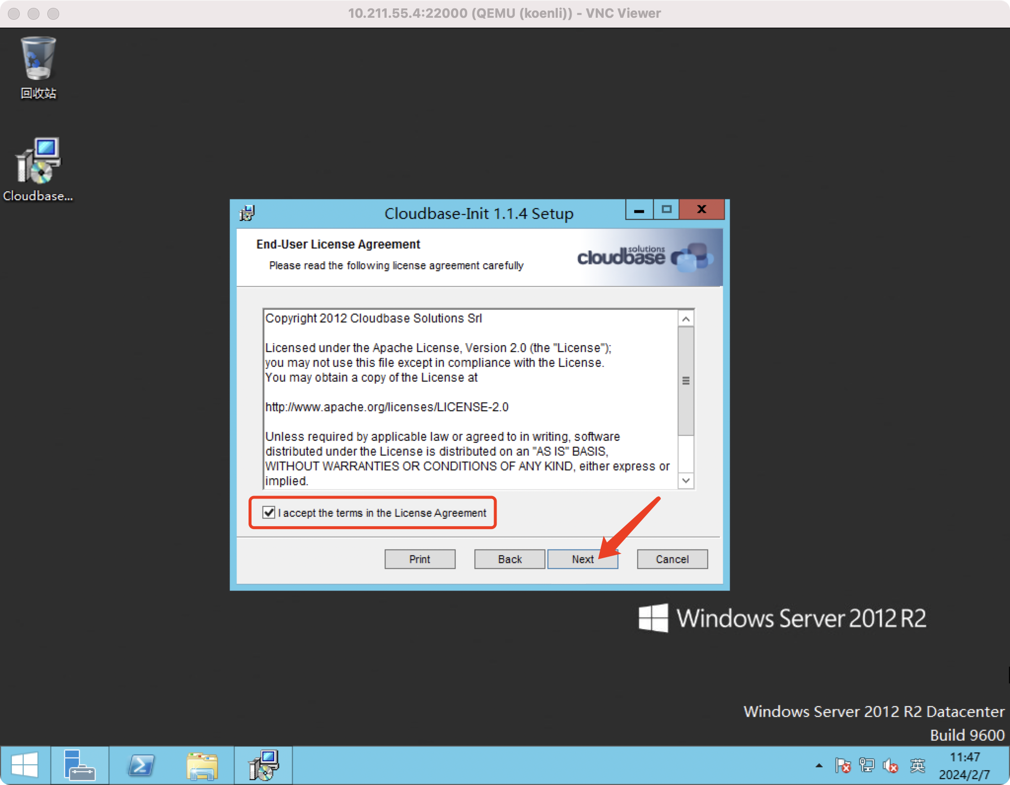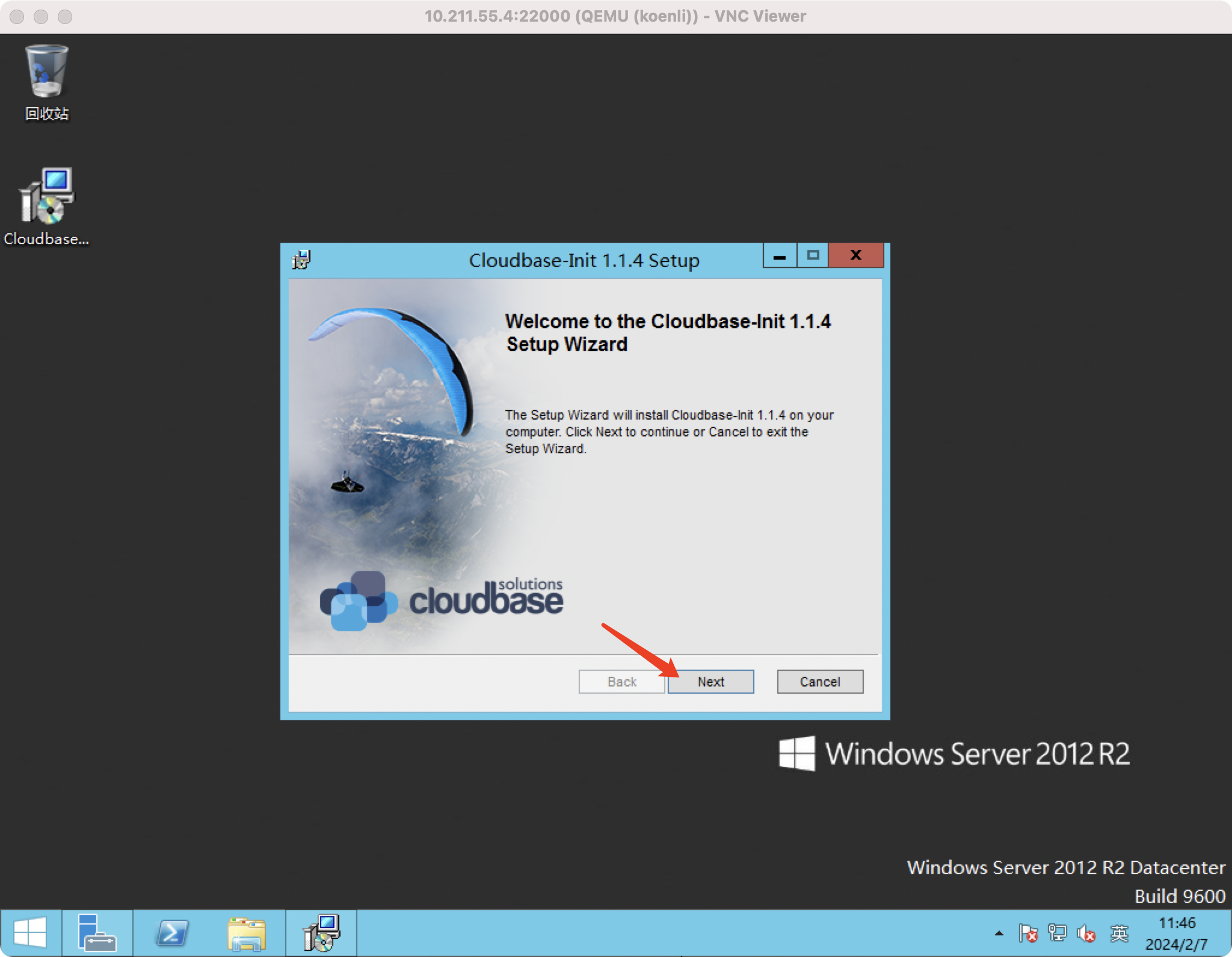 下载CloudbaseInitSetup_X_X_X_XXXX.msi安装包上传到桌面,双击打开Cloudbase-Init安装包,进入Cloudbase-Init安装界面,单击“Next”