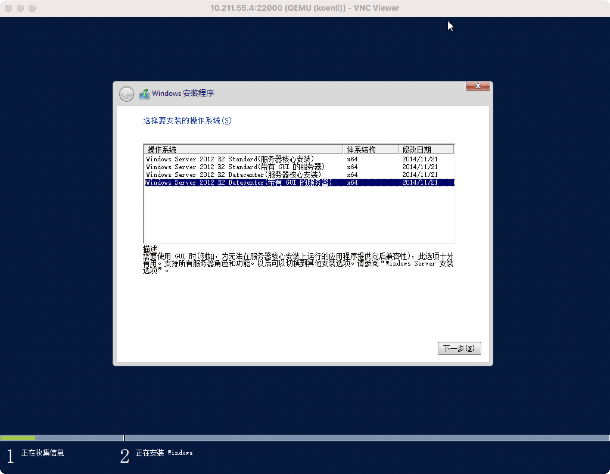 待安装程序启动后,选择要安装的操作系统“Windows Server 2012 R2 Datacenter(带有 GUI 的服务器)”,然后单击“下一步”