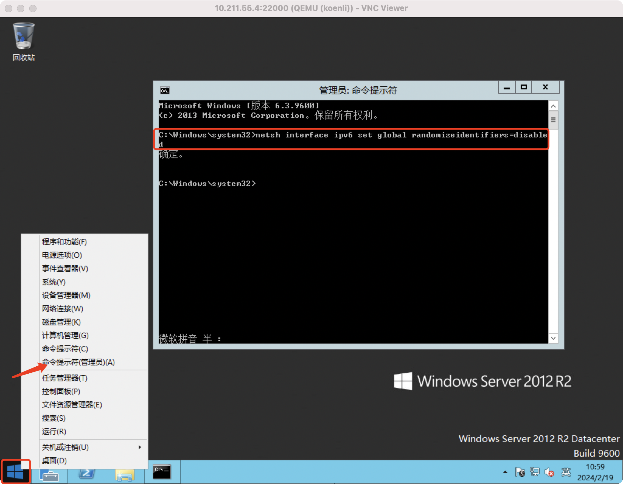 在左下角开始图标右键单击,选择“命令提示符(管理员)(A)”,在打开的cmd窗口输入以下命令并回车