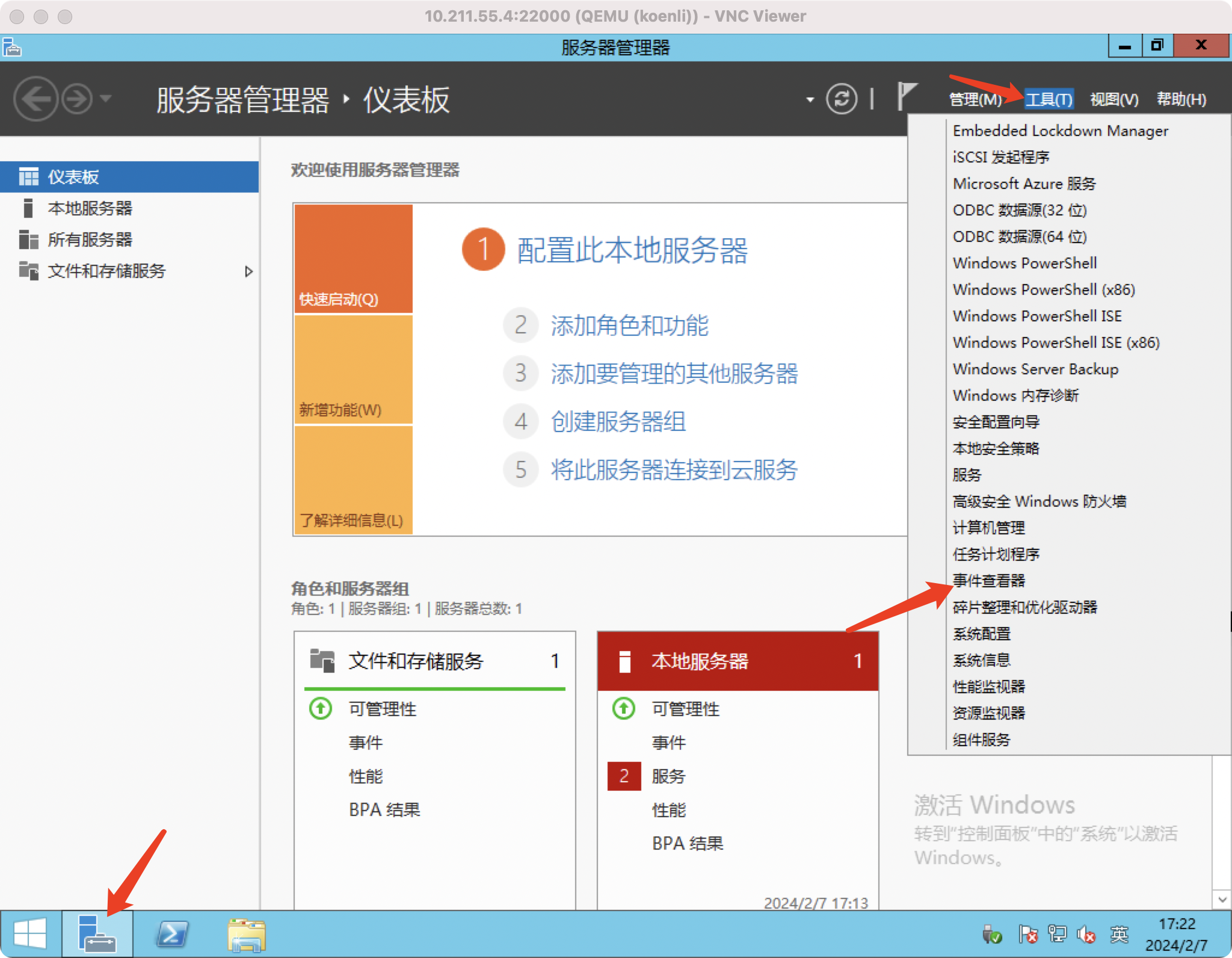 打开“服务器管理器”,单击右上角“工具”,选择“事件查看器”打开事件查看器