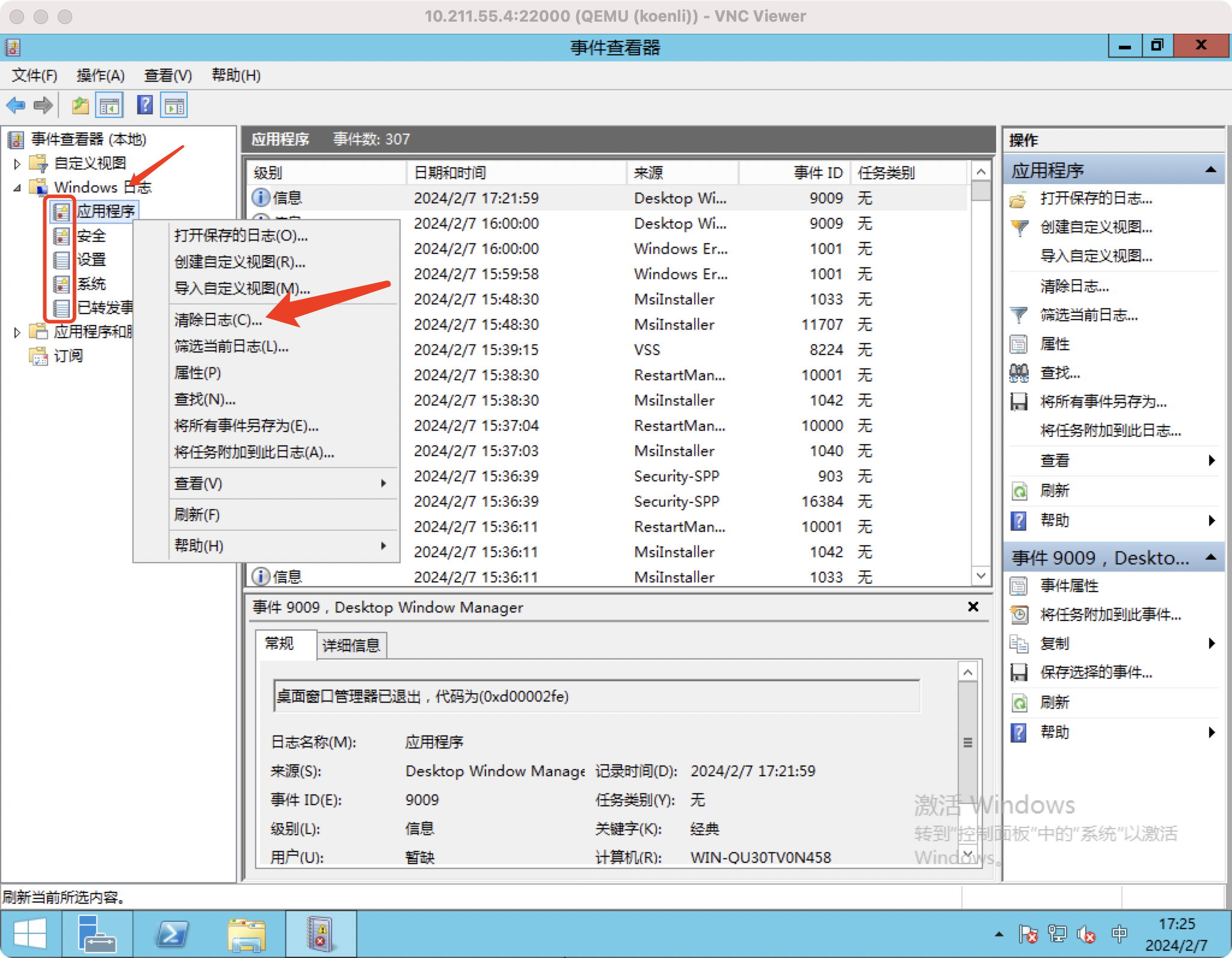 双击”Windows日志“,对“应用程序”右键单击,单击“清除日志(C)...”