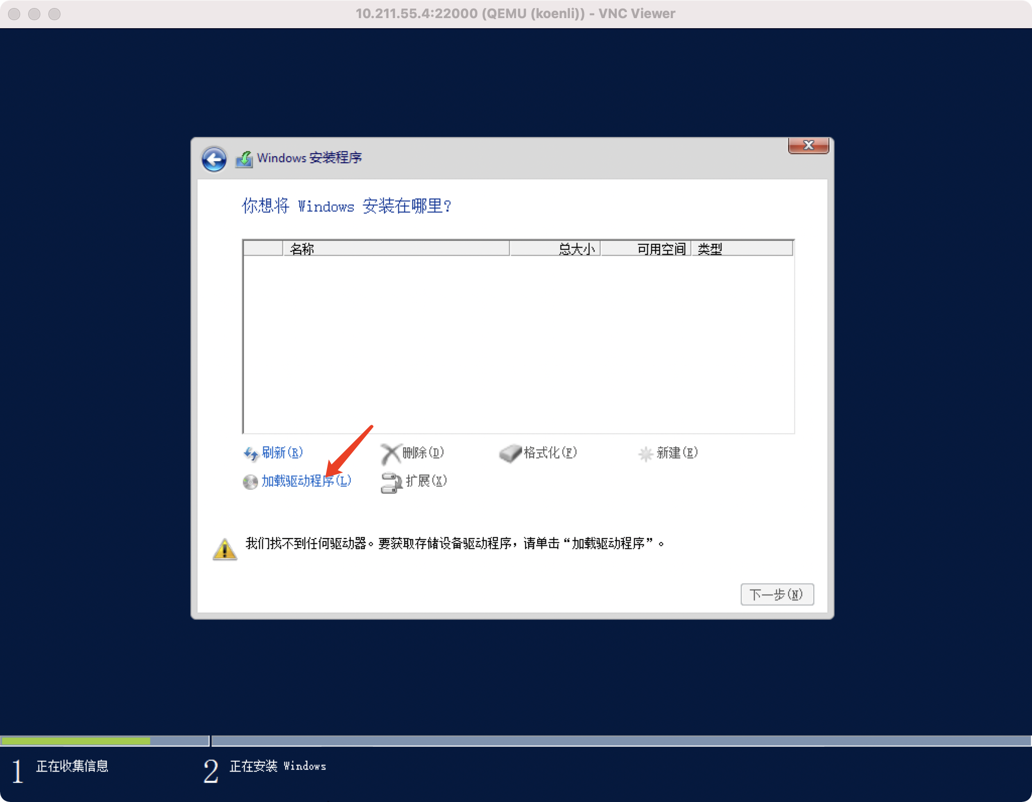 此时提示说“未找到任何驱动器。要获取存储设备驱动程序,请单击“加载驱动程序””。因为在KVM中,Windows虚拟机默认Disk使用的是Qemu IDE硬盘,默认网卡是100M网卡,为了使KVM主机在相同的配置下有更好的效率,我们在XML文件中设置了bus='virtio',使硬盘工作在SCSI模式,但因缺少virtio驱动,识别不到硬盘,所以我们需要用刚挂载的virtio驱动的ISO文件安装相应的virtio驱动。