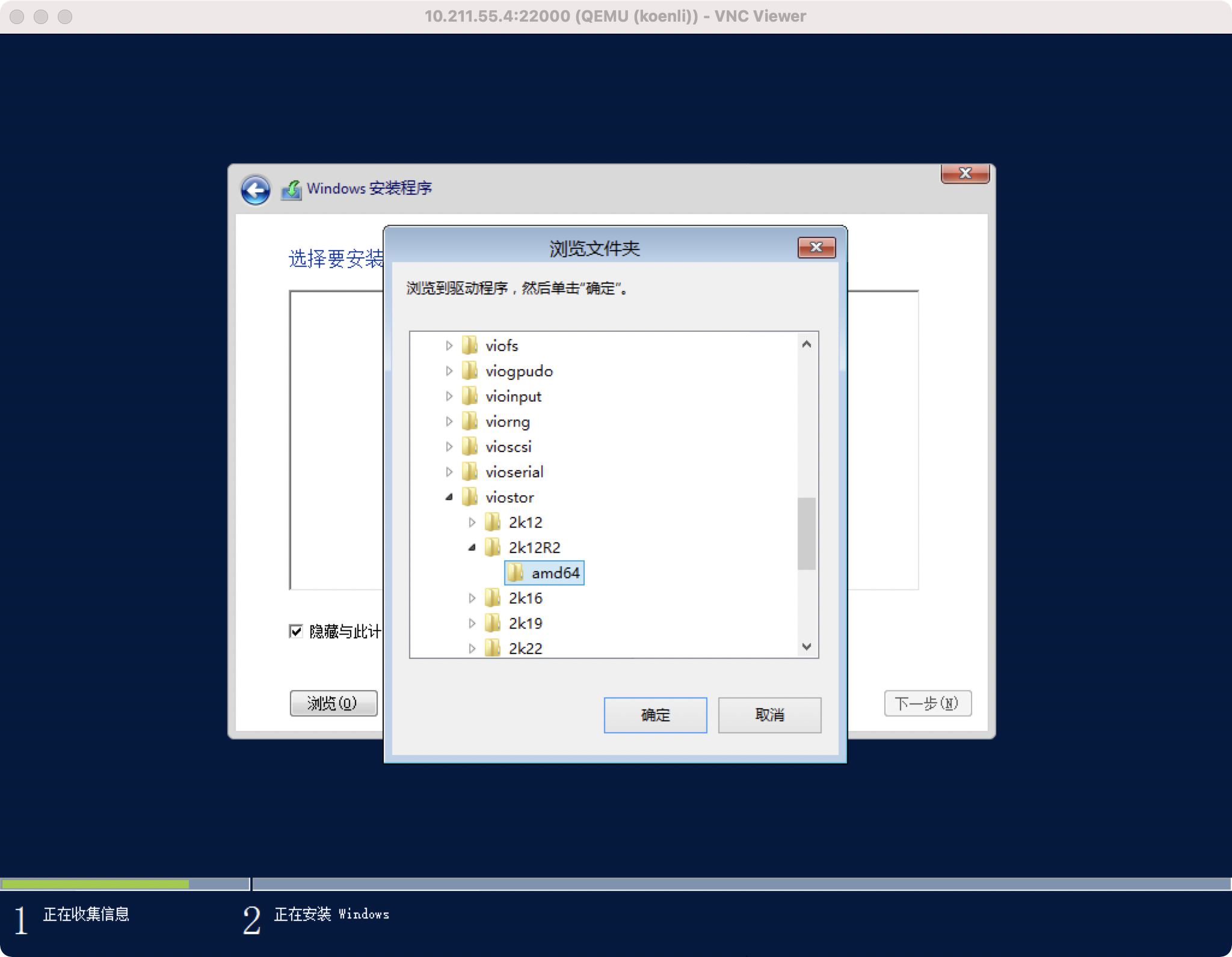 选择virtio驱动器的viostor/2k12R2/amd64目录,单击“确定”。