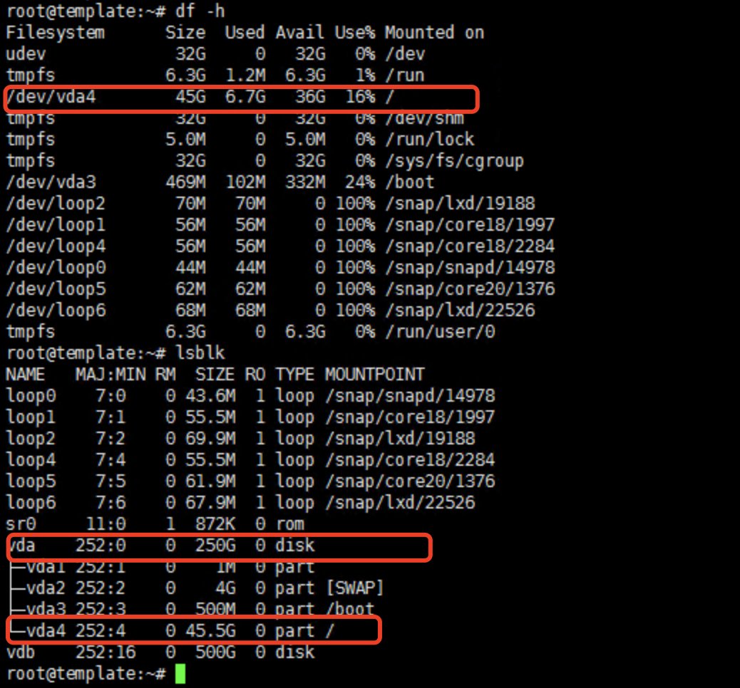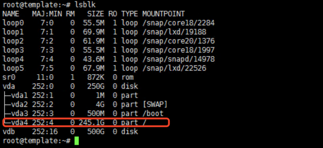 例如通过以下结果可知系统盘根分区(/dev/vda4)目前空间只有45.5G(扣除/boot和swap分区),但实际上/dev/vda磁盘有250G的空间,并且根(/)所在分区/dev/vda4为磁盘/dev/vda的最后一个分区(此点必须满足才可以继续下面的步骤)。
