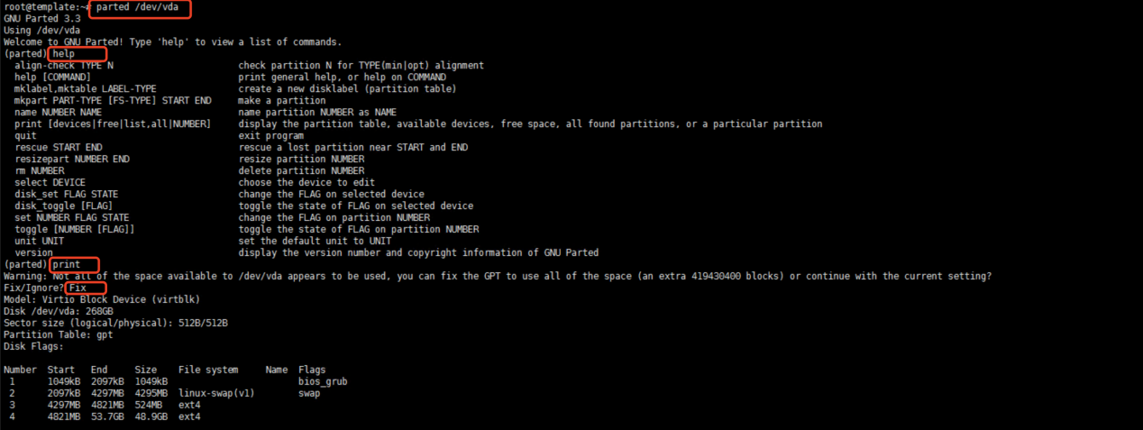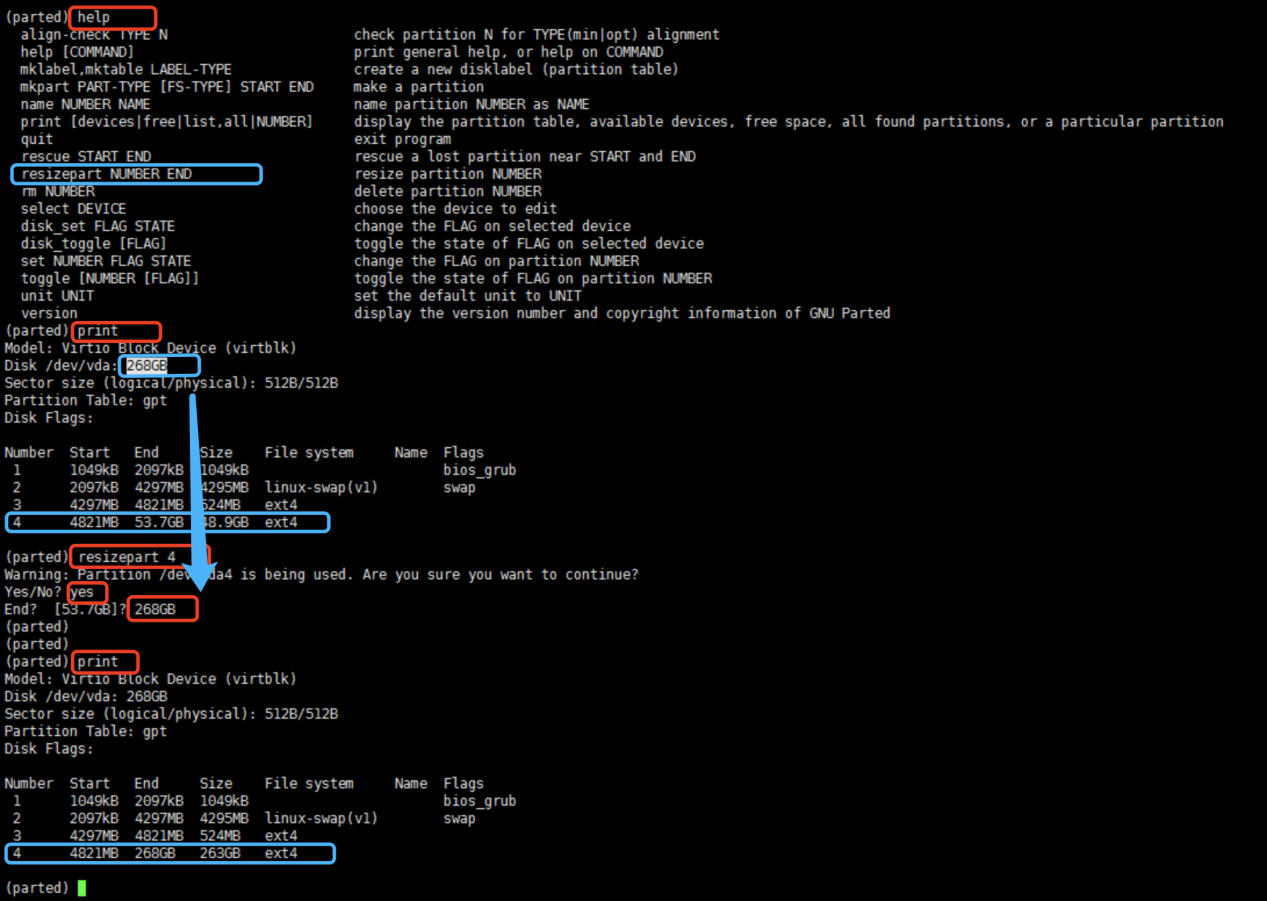 通过resizepart命令重置/dev/vda4分区的大小,END参数设置为Disk磁盘大小,将所有剩余空间均分配给/dev/vda4