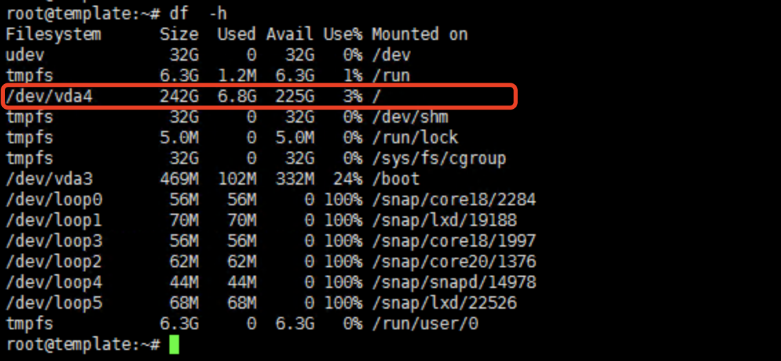 - 执行以下命令确认根分区磁盘空间是否扩容成功