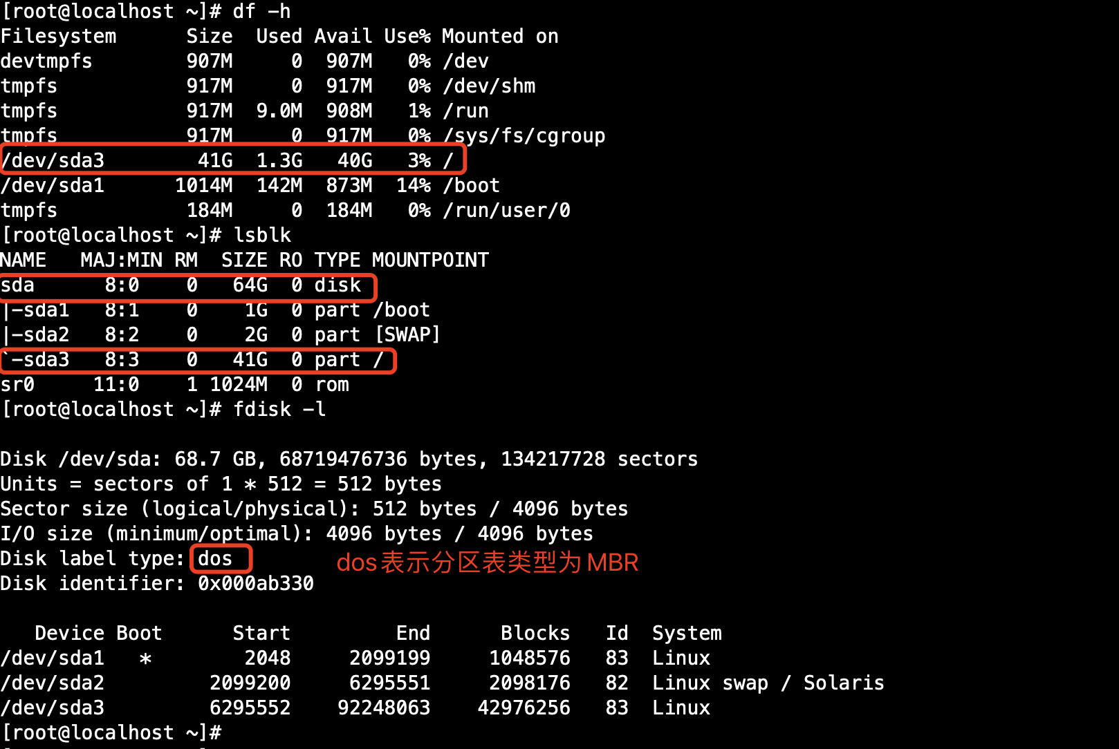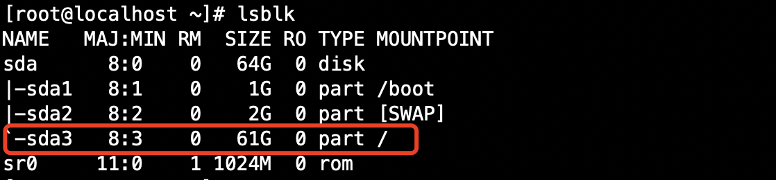 例如通过以下结果可知系统盘根分区(/dev/sda3)目前空间只有41G(扣除/boot和swap分区),但实际上/dev/sda磁盘有64G的空间,并且根(/)所在分区/dev/sda3为磁盘/dev/sda的最后一个分区(此点必须满足才可以继续下面的步骤)。