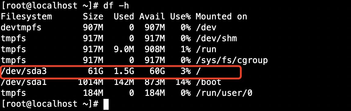 - 执行以下命令确认根分区磁盘空间是否扩容成功