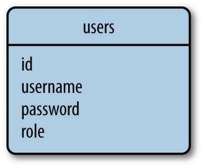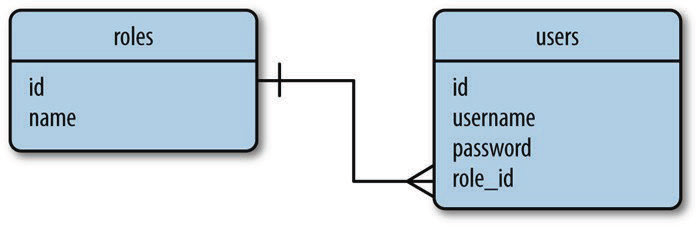在这个数据库关系图中,roles表存储所有可用的用户角色,每个角色都使用一个唯一的id值(即表的主键)进行标识。users表包含用户列表,每个用户也有唯一的id值。除了id主键之外,roles表中还有name列,users表中还有username列和password列。users表中的role_id列是外键,引用角色的id,通过这种方式为每个指定角色。
