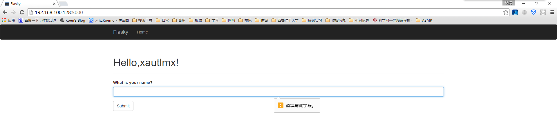 如果用户提交表单之前没有输入名字,Required()验证函数会捕获这个错误(如下图)。注意一下扩展自动提供了多少功能。这说明像Flask-WTF和Flask-Bootstrap这样设计良好的扩展能让程序具有强大的功能。