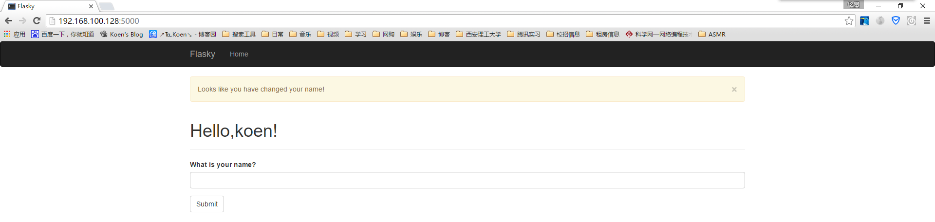 用户提交表单后,服务器收到一个包含数据的POST请求。validate_on_submit()会调用name字段上附属的Required()验证函数。如果名字不为空,就能通过验证,validate_on_submit()返回True。现在,用户输入的名字可通过字段的data属性获取。在if语句中,把名字赋值给局部变量name,然后再把data属性设为空字符串,从而清空表单字段。最后一行调用render_template()函数渲染模板,但这一次参数name的值为表单中输入的名字,因此会显示一个针对该用户的欢迎消息。