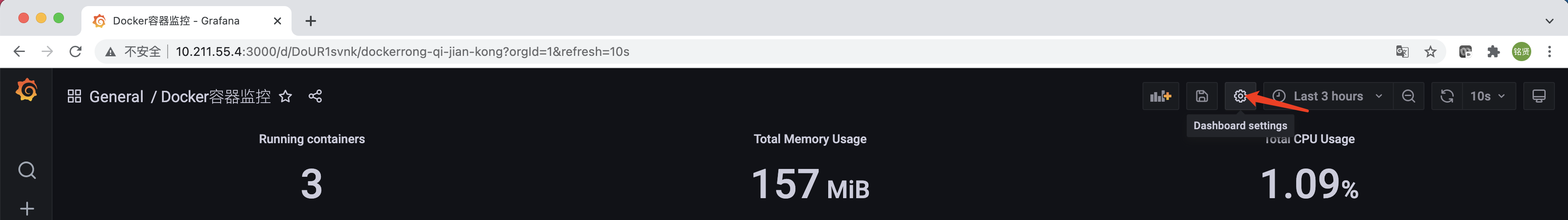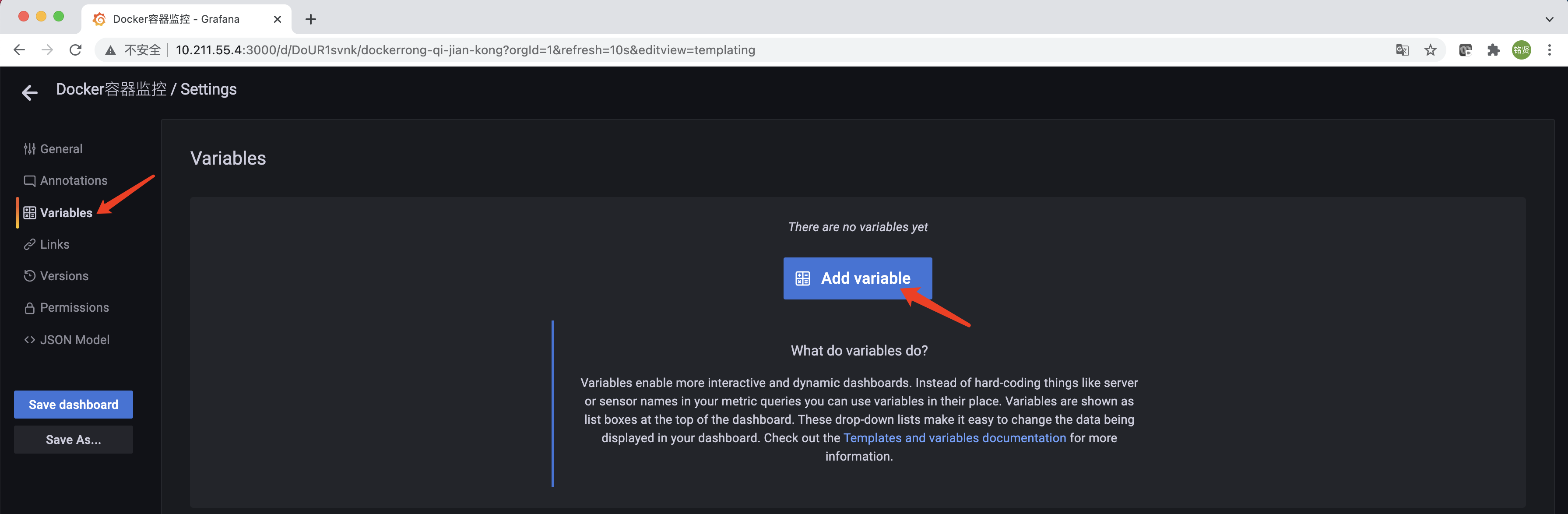 默认情况下,此模板会将所有节点的cAdvisor数据集中显示,无法区别节点。为了实现选择某一个节点,仪表盘只显示对应节点的监控数据,可对仪表盘进行配置。首先单击仪表盘右上方的"齿轮状按钮(Dashboard settings)"