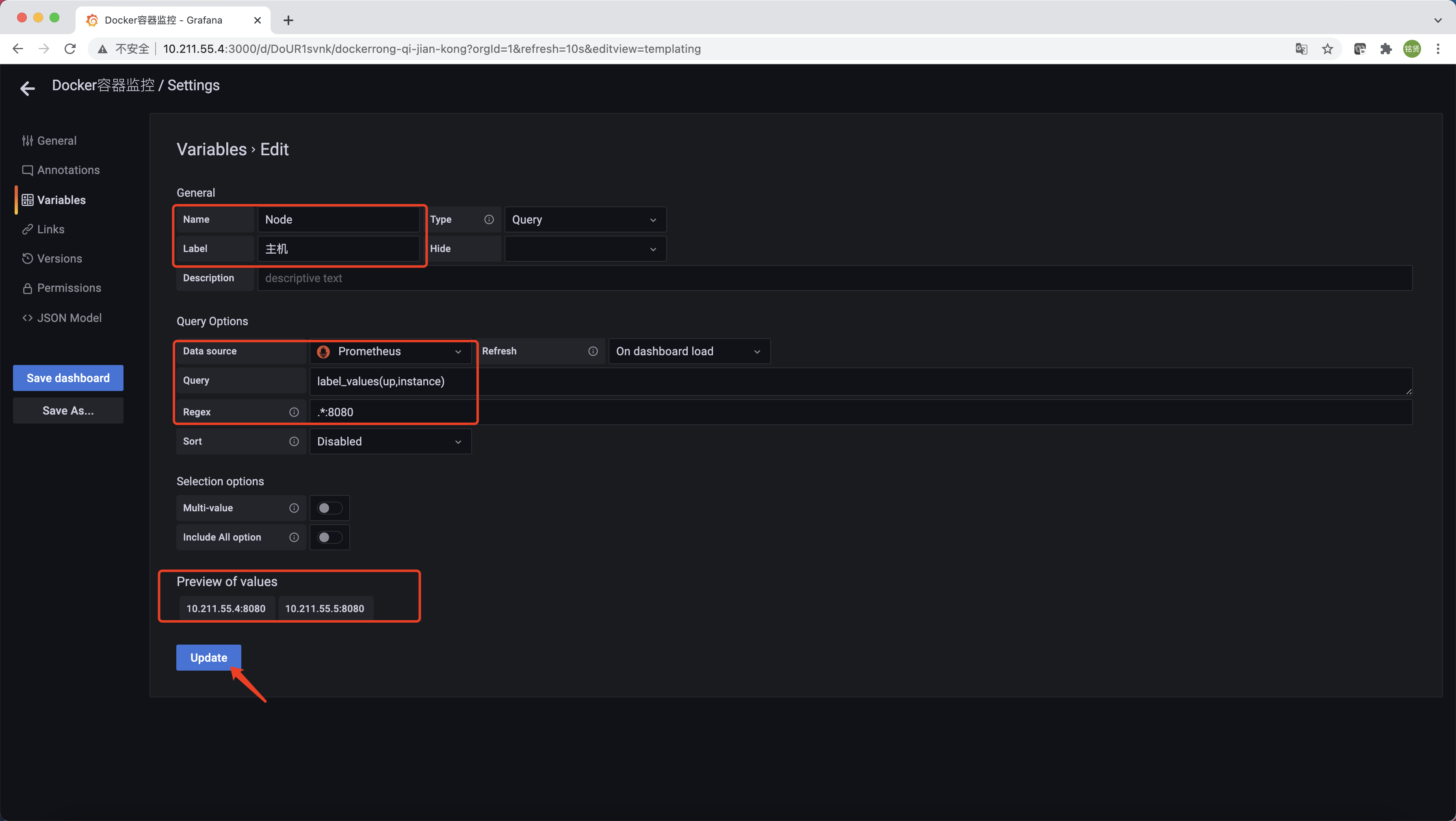 配置变量名Name和标签名(仪表盘显示名称)Lable;选择数据源为Prometheus;配置查询语句为label_values(up,instance),查找出所有Targets主机信息;配置正则表达式为.*:8080,只匹配cAdvisor的主机。在页面下方的Preview of values处可查看预览结果,单击"Update",最后单击左侧的"Save dashboard"