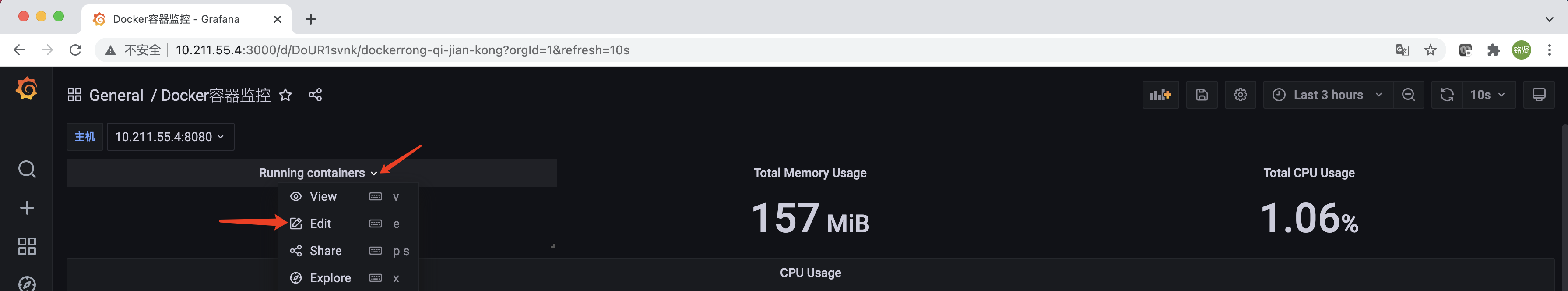 此时返回仪表盘页面可以看到已经出现刚才添加的可选择主机的选项,但发现即使选择了其中的一台主机,下方的监控数据仍然没有发生变化,还是展示的所有cAdvisor主机的监控数据。这是因为还需要对监控数据的查询表达式增加筛选条件。以”运行容器数量”为例,单击"Running containers"这个Panel右侧的向下箭头,选择"Edit"
