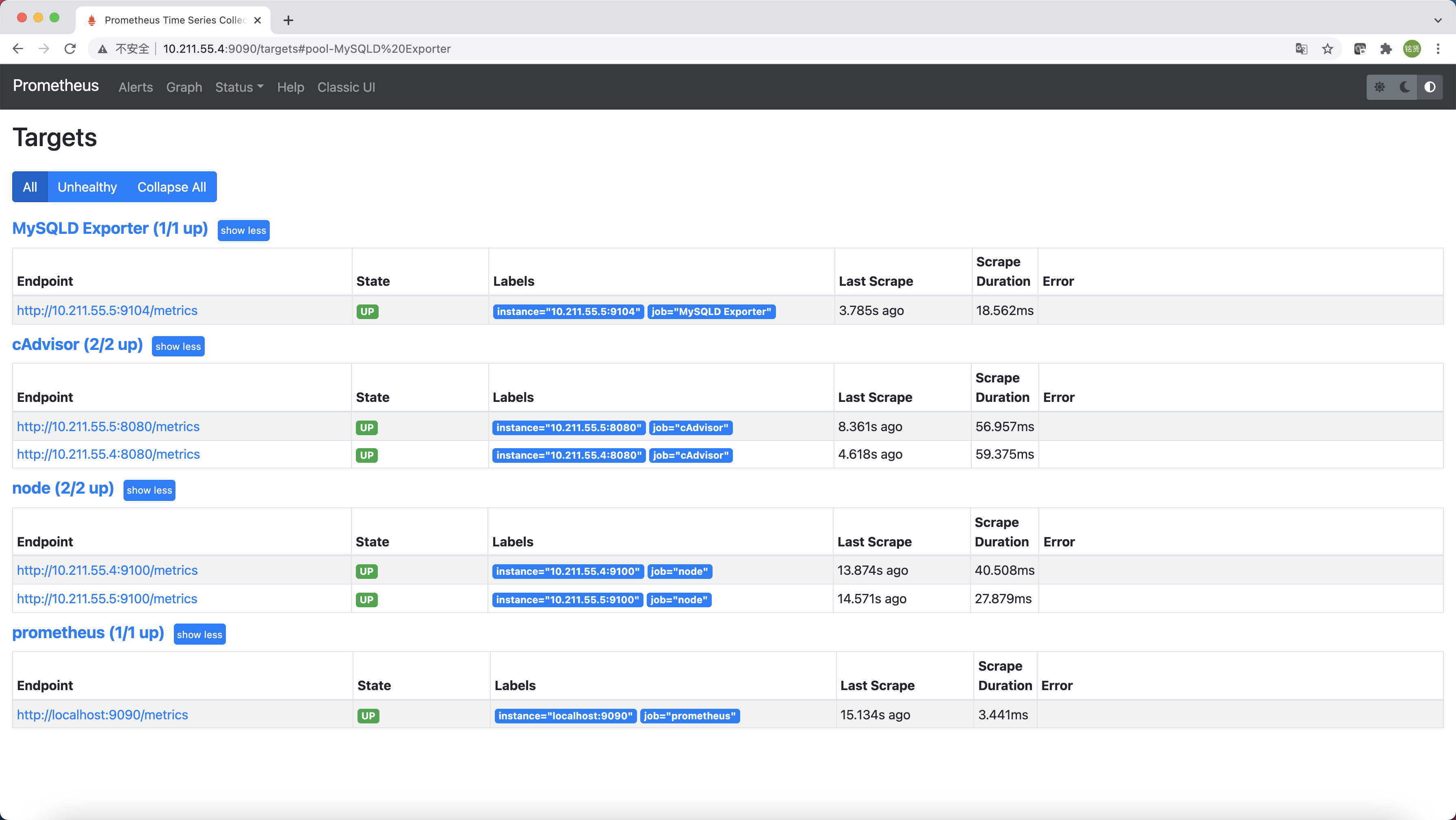 访问Prometheus的UI,单击“Status”->”Targets“可以看到MySQLD Exporter的Target已经处于UP状态