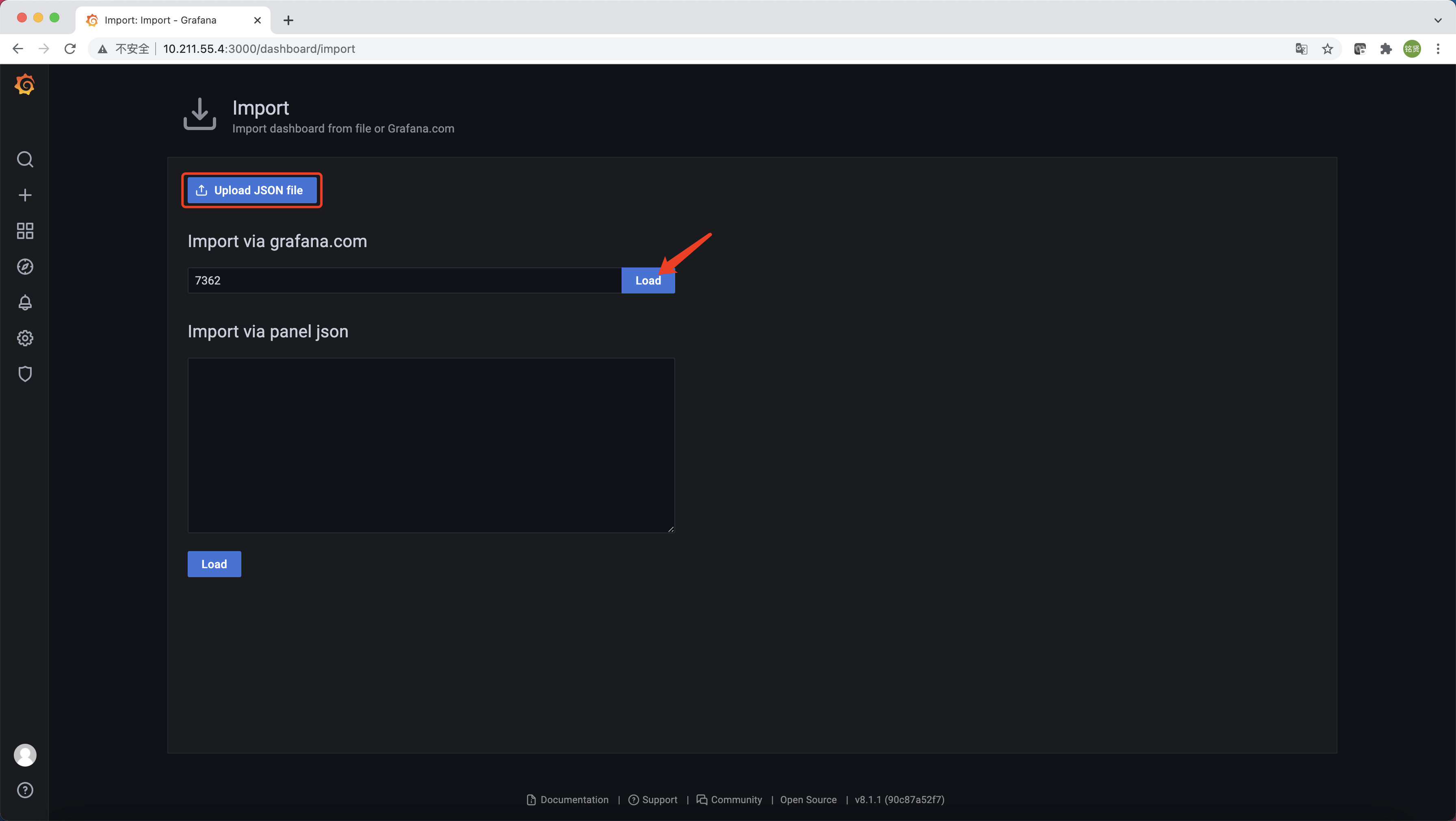 选择"Dashboards"->"Manage"->"Import",输入仪表盘模板ID7362,单击"Load"