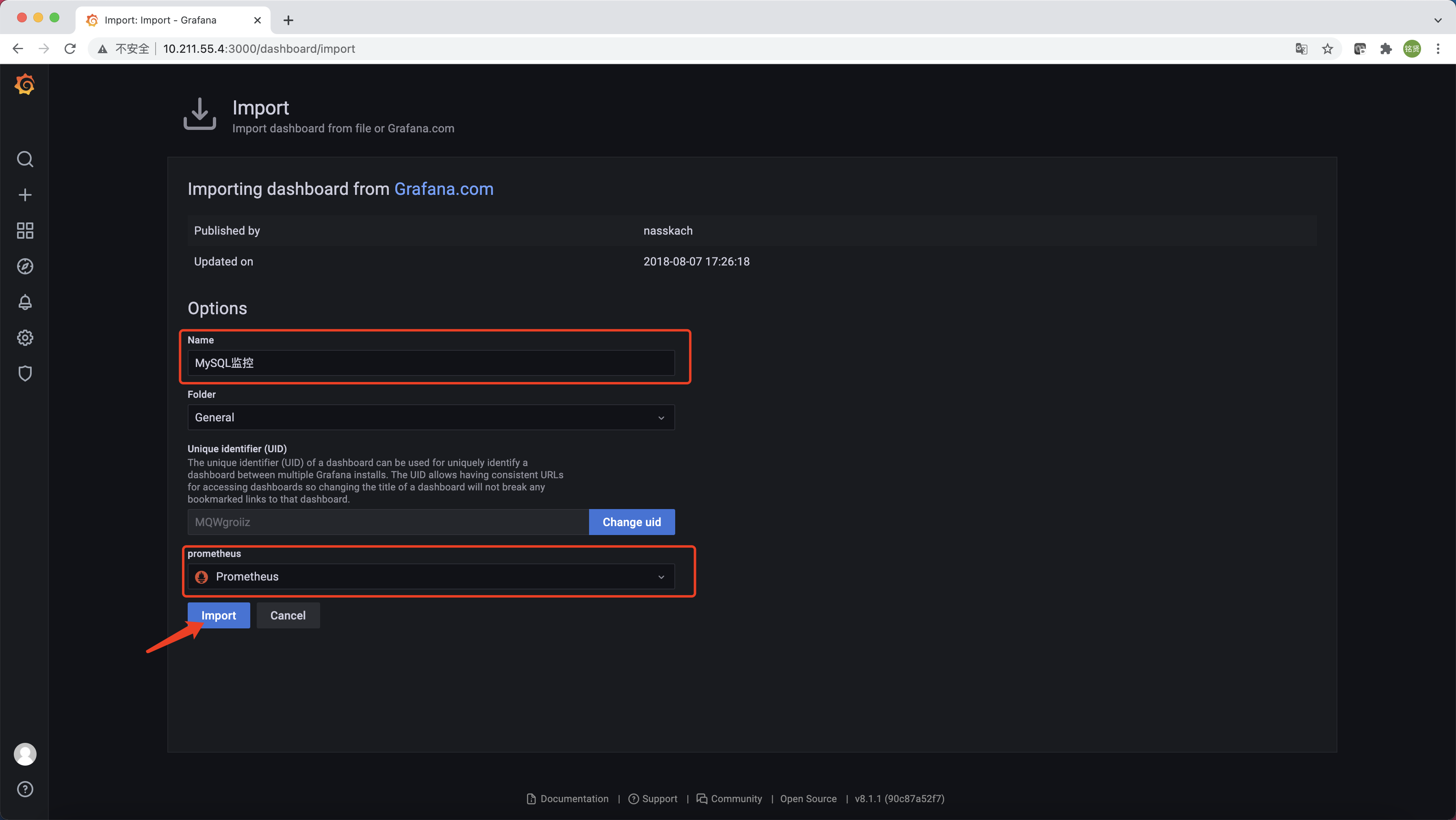 设置仪表盘名称,选择数据源为Prometheus,单击"Import"完成仪表盘创建。