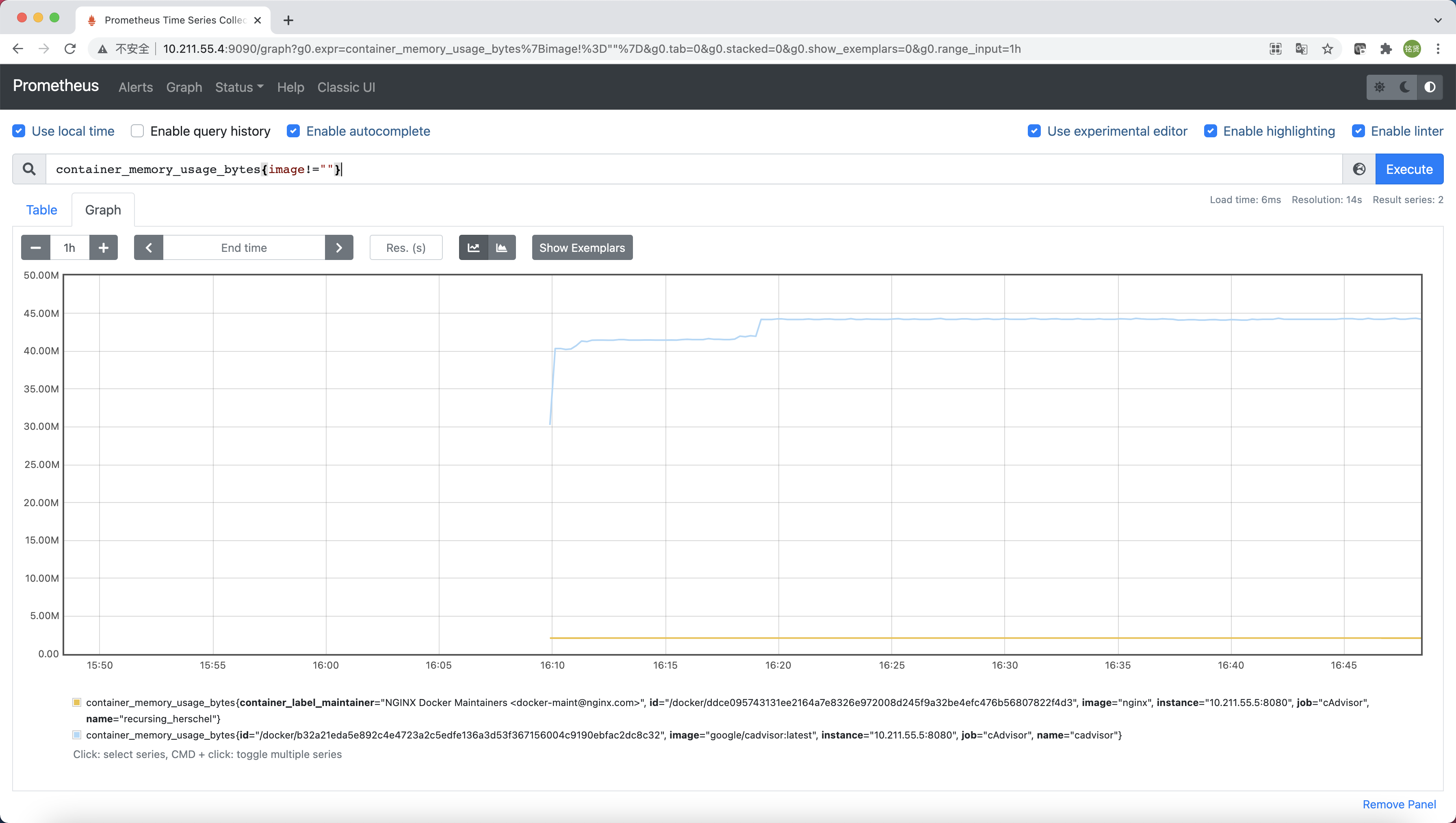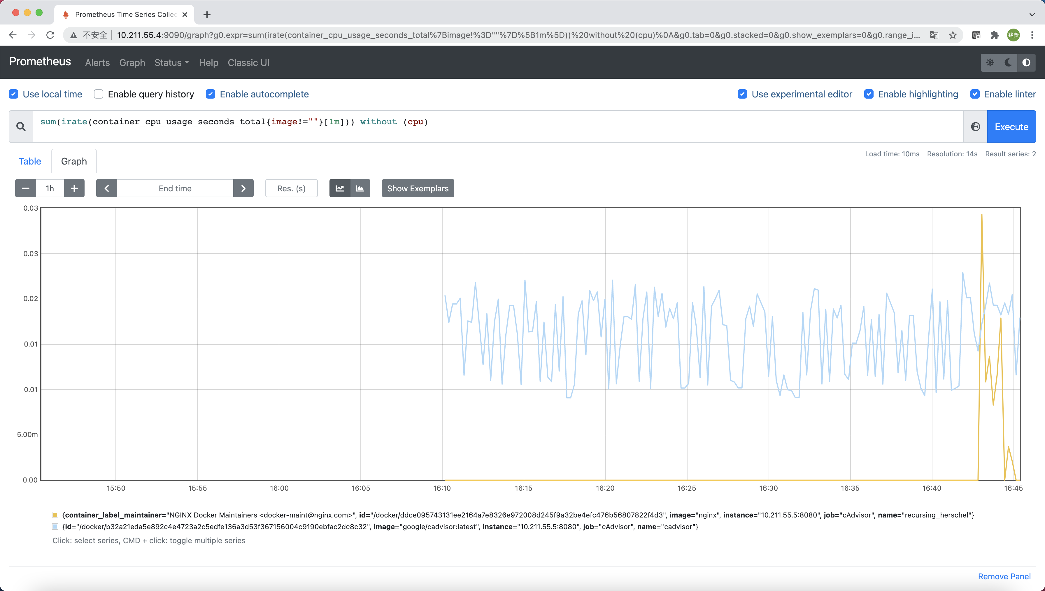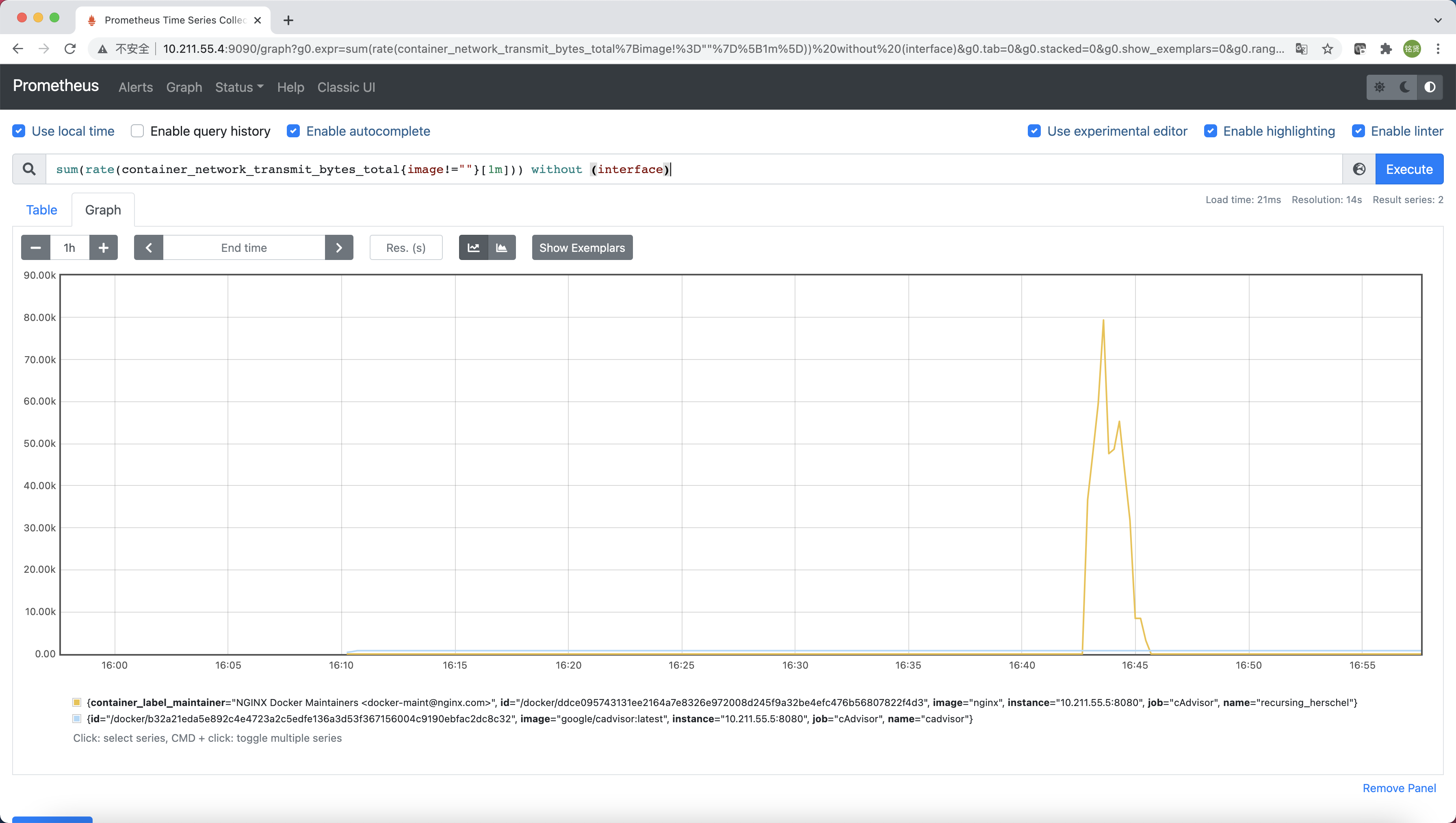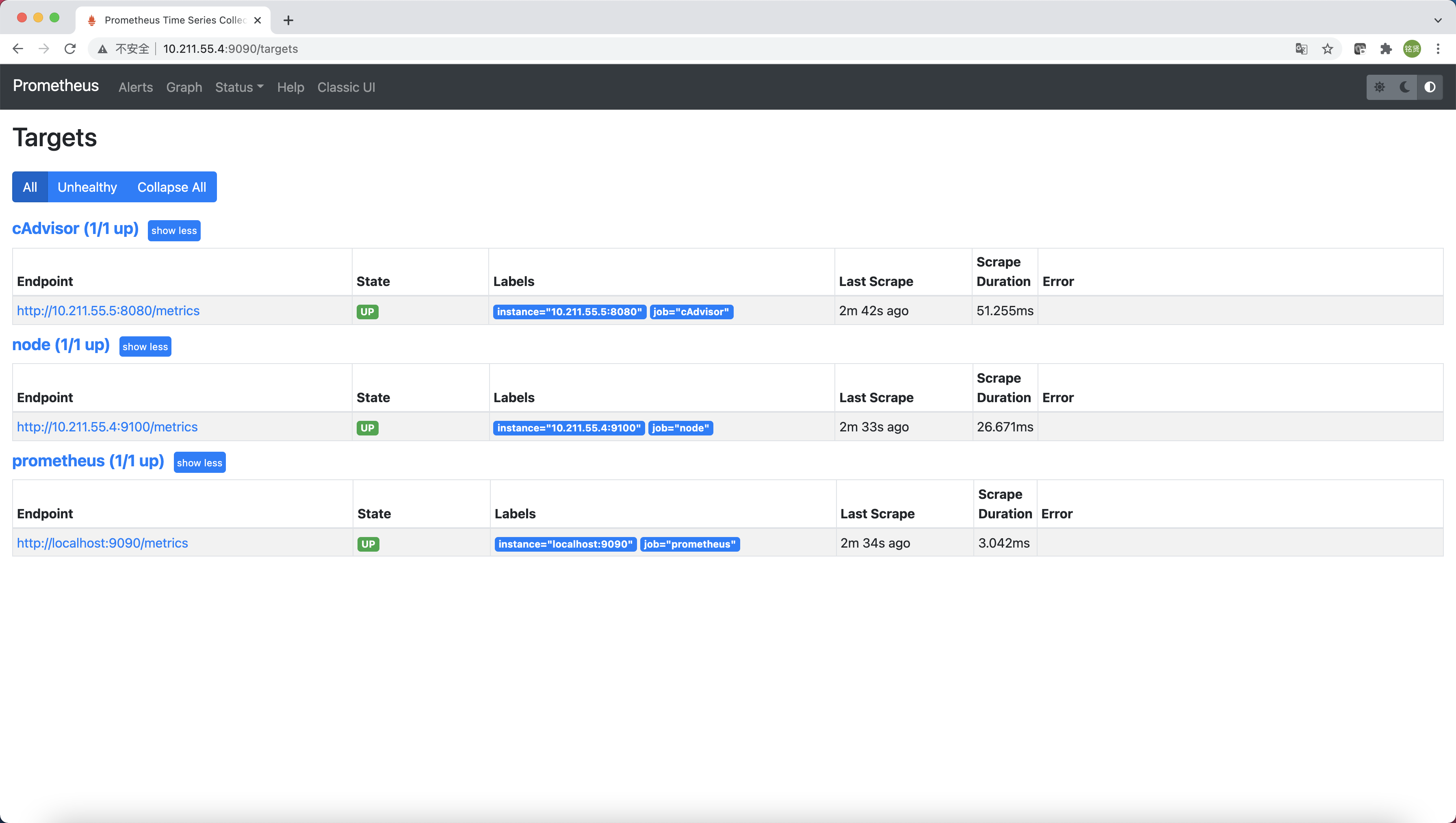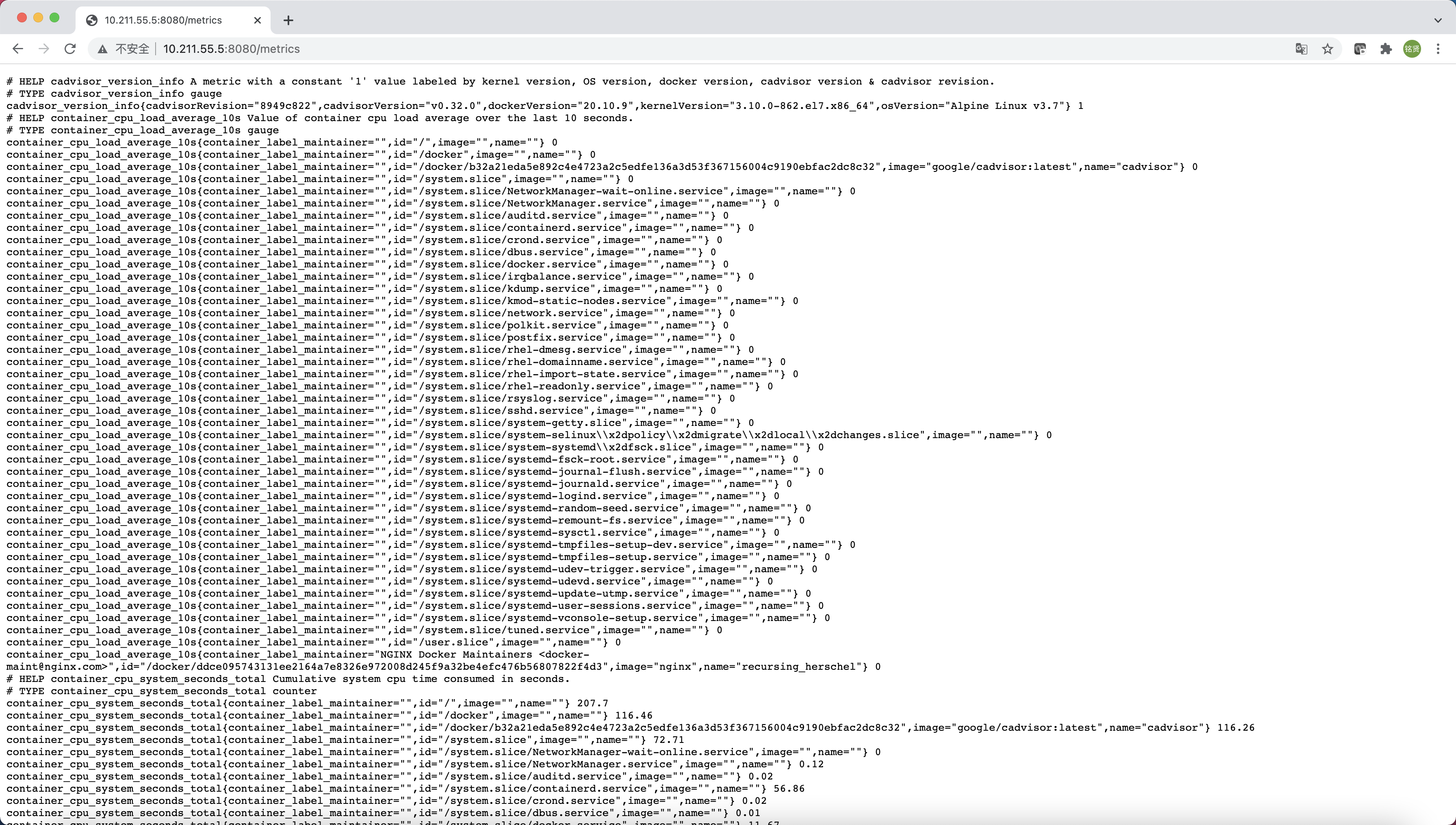 而在多主机的情况下,在所有节点上运行一个cAdvisor再通过各自的UI查看监控信息显然不太方便,同时cAdvisor默认只保存2分钟的监控数据。好消息是cAdvisor已经内置了对Prometheus的支持。访问http://IP:8080/metrics即可获取到标准的Prometheus监控样本输出