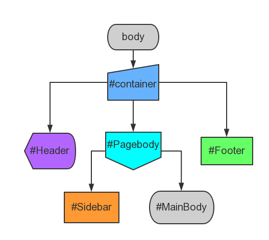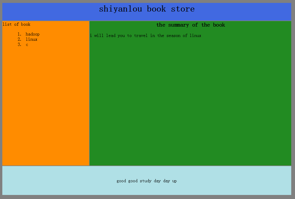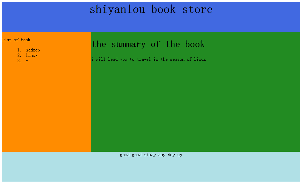 <body> <divid="container"> <divid="header"> <h1>shiyanlou book store</h1> </div> <divid="sidebar"> <dl> <dt>list of book</dt> <dd> <ol> <li>hadoop</li> <li>linux</li> <li>c</li> </ol> </dd> </dl> </div> <divid="mainbody"> <h1>the summary of the book</h1> <p>i will lead you to travel in the season of linux</p> </div> <divid="footer">good good study day day up</div> </div> </body> </html>