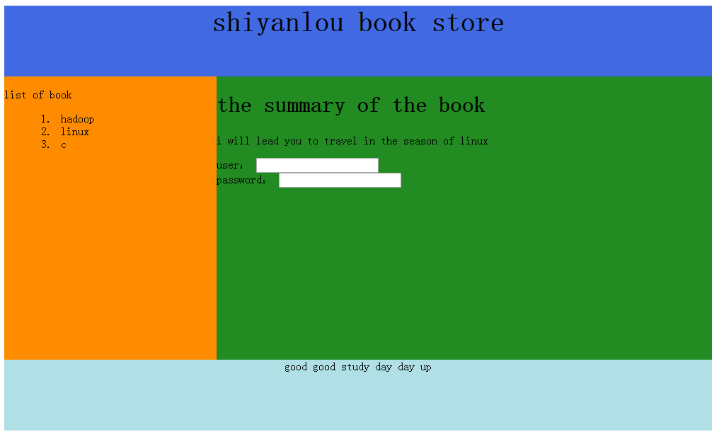 <body> <divid="container"> <divid="header"> <h1>shiyanlou book store</h1> </div> <divid="sidebar"> <dl> <dt>list of book</dt> <dd> <ol> <li>hadoop</li> <li>linux</li> <li>c</li> </ol> </dd> </dl> </div> <divid="mainbody"> <h1>the summary of the book</h1> <p>i will lead you to travel in the season of linux</p> <form> user: <inputtype="text"name="user"> <br /> password: <inputtype="password"name="password"> </form> </div> <divid="footer">good good study day day up</div> </div> </body> </html>