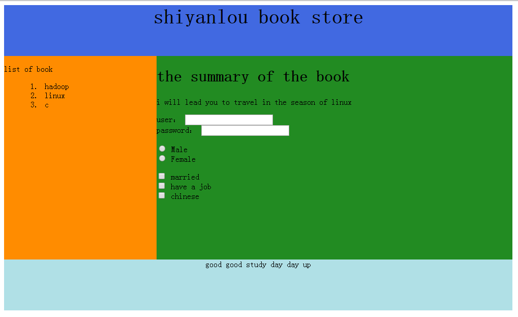 <body> <divid="container"> <divid="header"> <h1>shiyanlou book store</h1> </div> <divid="sidebar"> <dl> <dt>list of book</dt> <dd> <ol> <li>hadoop</li> <li>linux</li> <li>c</li> </ol> </dd> </dl> </div> <divid="mainbody"> <h1>the summary of the book</h1> <p>i will lead you to travel in the season of linux</p> <form> user: <inputtype="text"name="user"> <br /> password: <inputtype="password"name="password"> </form> <form> <inputtype="radio"name="sex"value="male" /> Male <br/> <inputtype="radio"name="sex"value="female" /> Female </form> <form> <inputtype="checkbox"name="married" /> married <br/> <inputtype="checkbox"name="have a job" /> have a job <br/> <inputtype="checkbox"name="chinese" /> chinese </form> </div> <divid="footer">good good study day day up</div> </div> </body> </html>