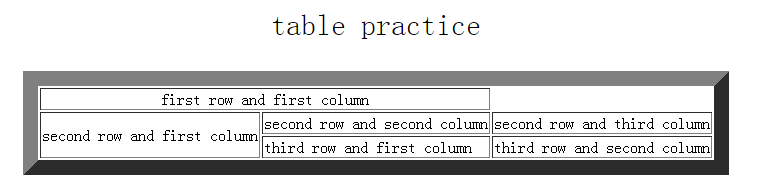 <html> <head> <title >TABLE</title> </head> <bodystyle="font-size:30px"> <pstyle="text-align:center">table practice</p> <tablealign="center"border="15" > <tr> <tdalign="center"colspan="2">first row and first column</td> </tr> <tr> <tdrowspan="2">second row and first column </td> <td>second row and second column </td> <td >second row and third column</td> </tr> <tr> <td>third row and first column </td> <td>third row and second column </td> </tr> </table> </body> </html>
