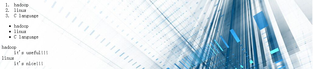 <trvalign="top"> <tdstyle="background-color: darkorange;width:300px"> <dl> <dt>list of book</dt> <dd> <ol> <li>hadoop</li> <li>linux</li> <li>c</li> </ol> </dd> </dl> </td> <tdstyle="background-color: forestgreen;height:500px;width:700px;"> <h1style="font-size: 20px;text-align: center">the summary of the book</h1> <p>i will lead you to travel in the season of linux</p> </td> </tr>