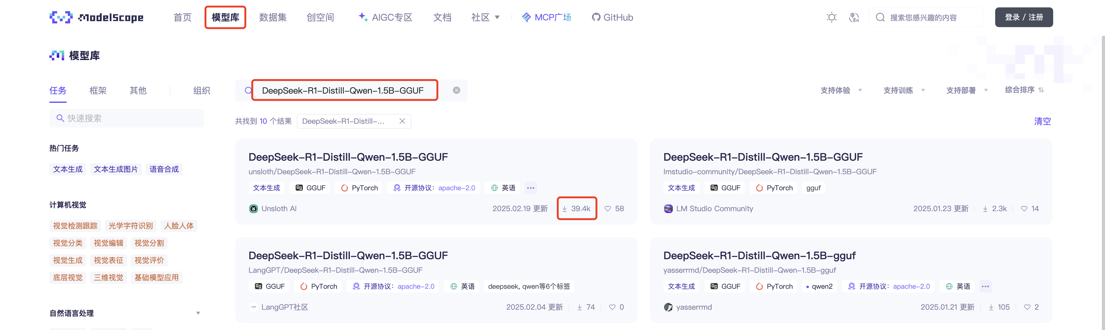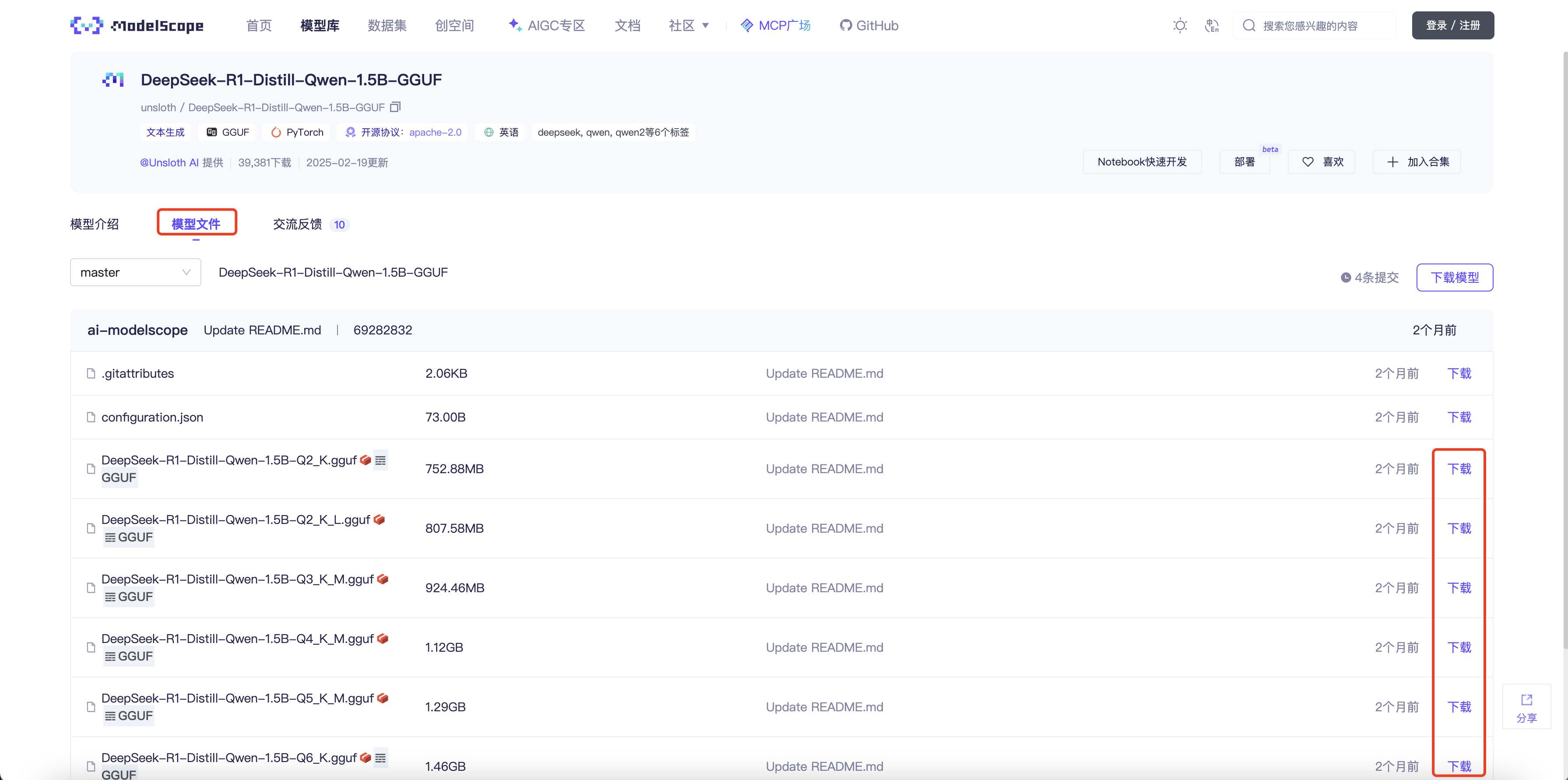 到魔搭社区搜索并下载模型的GGUF文件,上传到/root