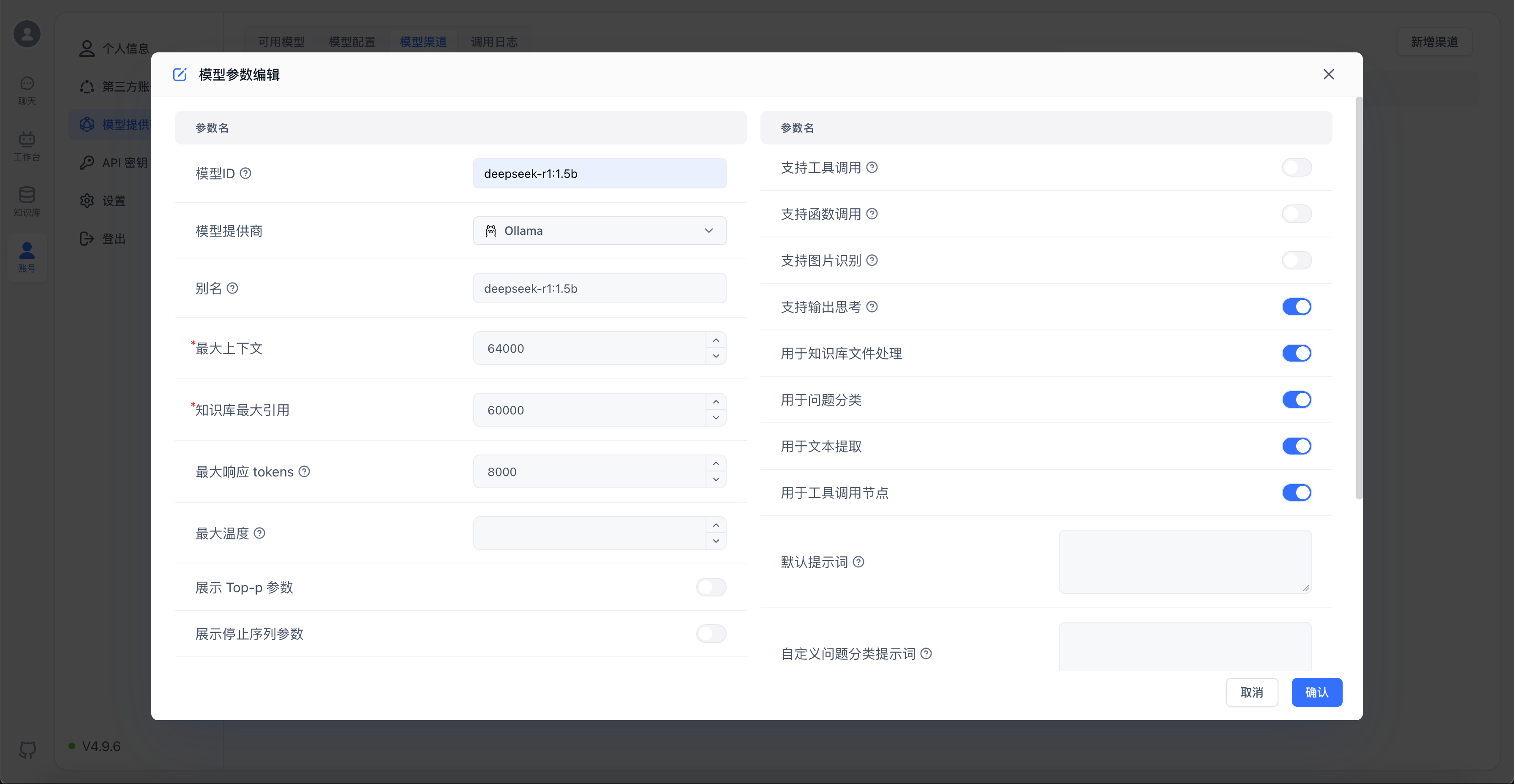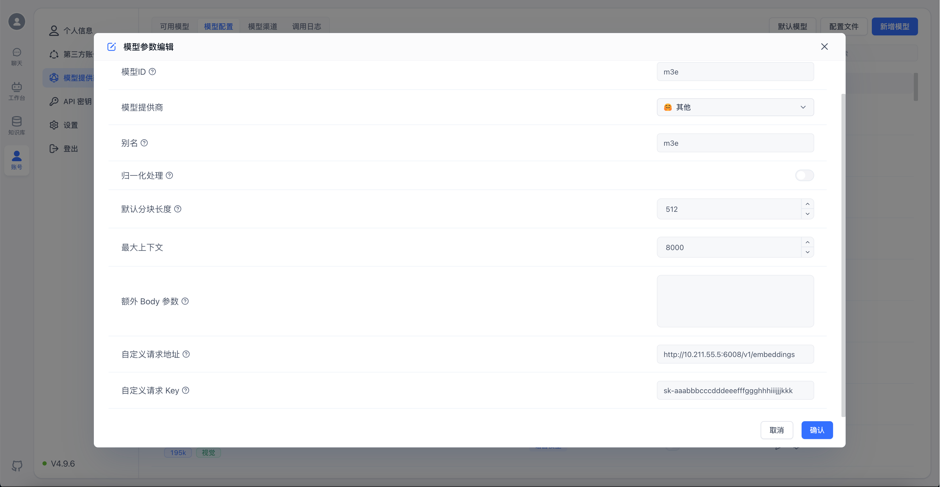 API密钥:从模型厂商处获取的API凭证。注意部分厂商需要提供多个密钥组合,可以根据提示进行输入;