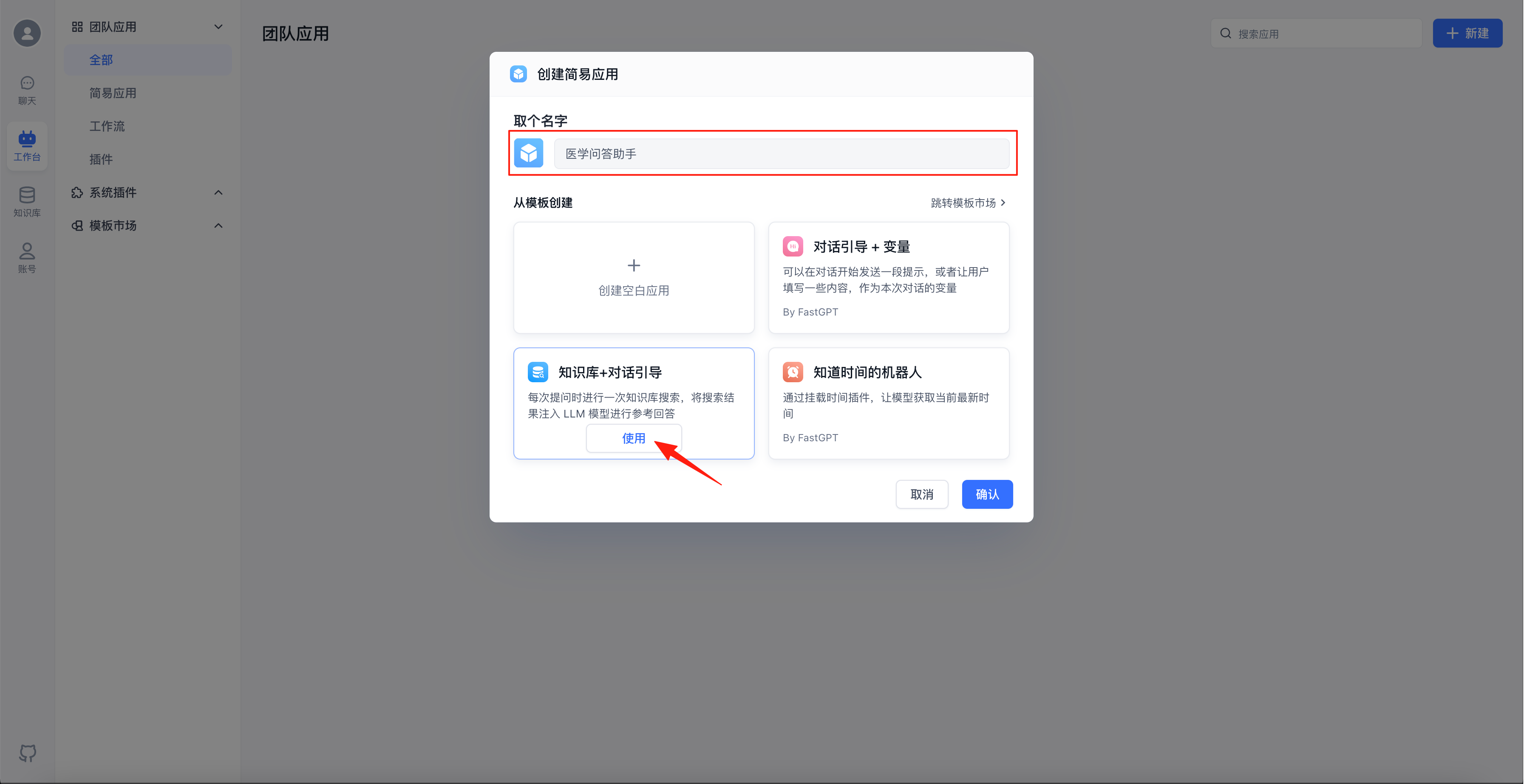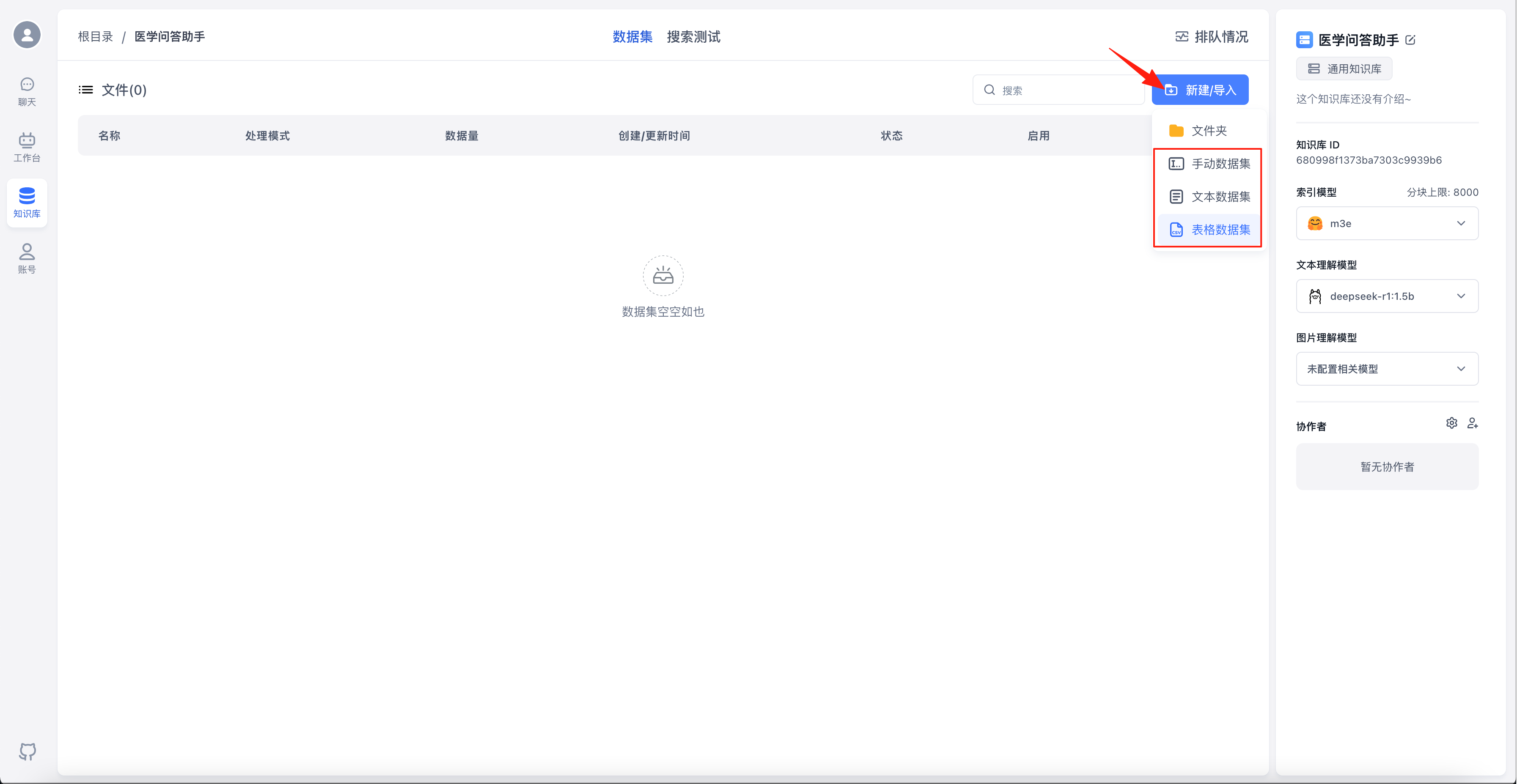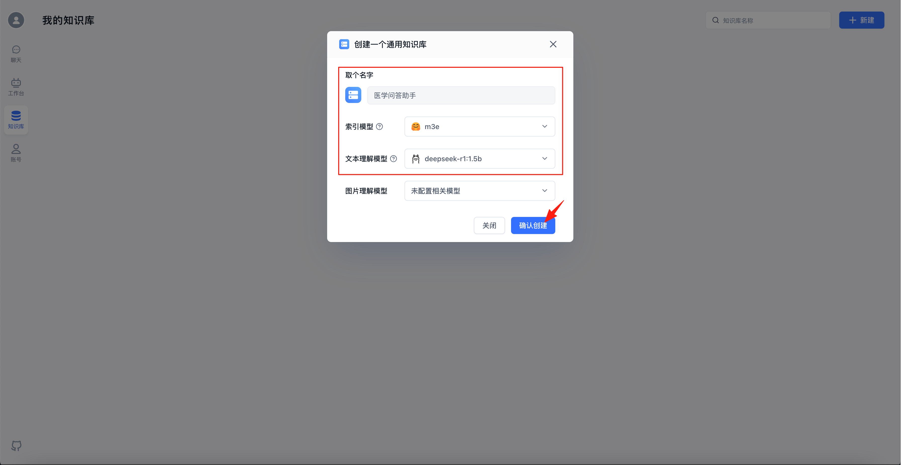 给知识库取个名字,索引模型和文本理解模型选择上面配置的m3e