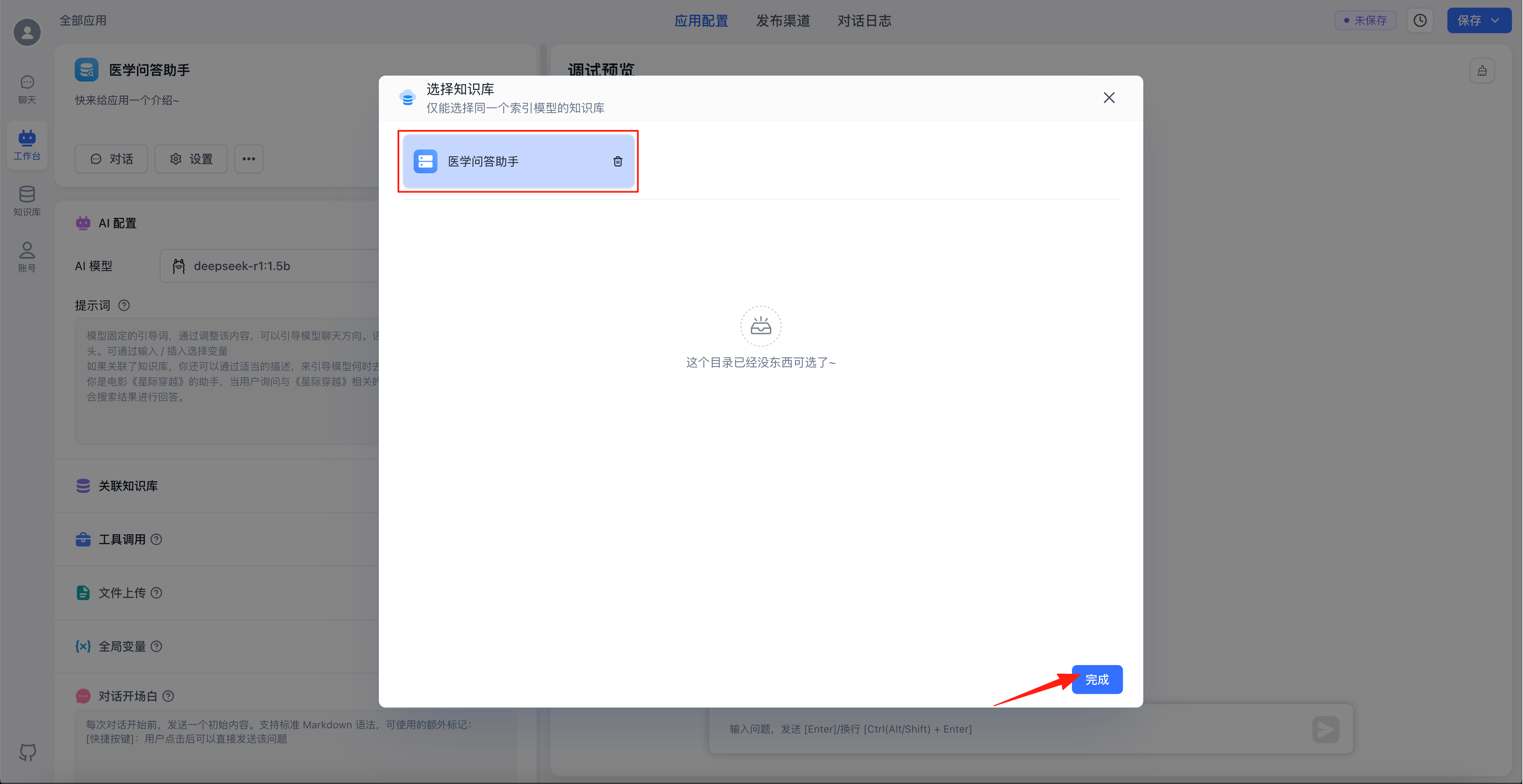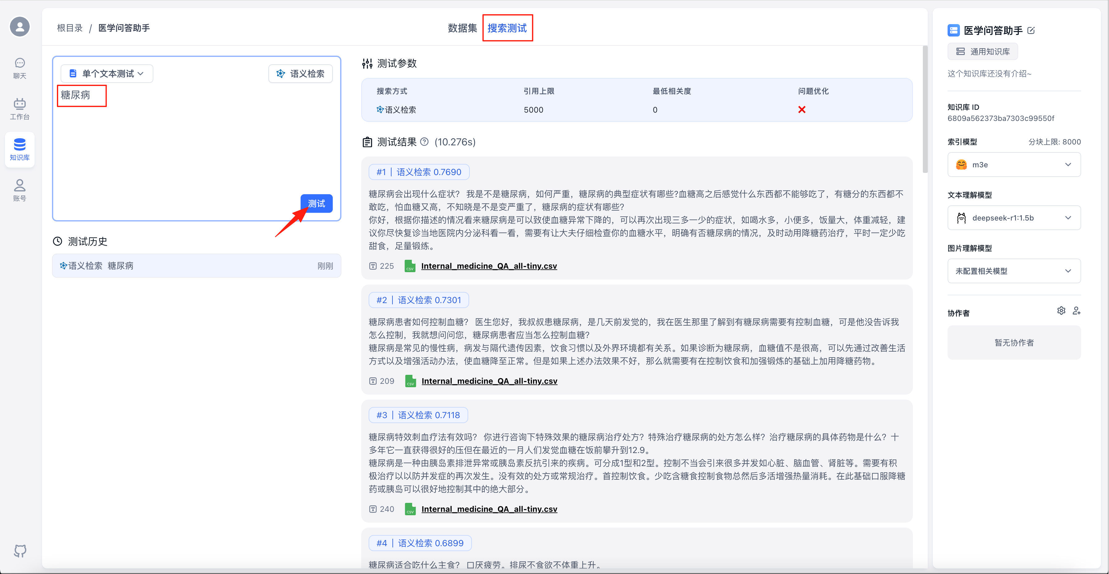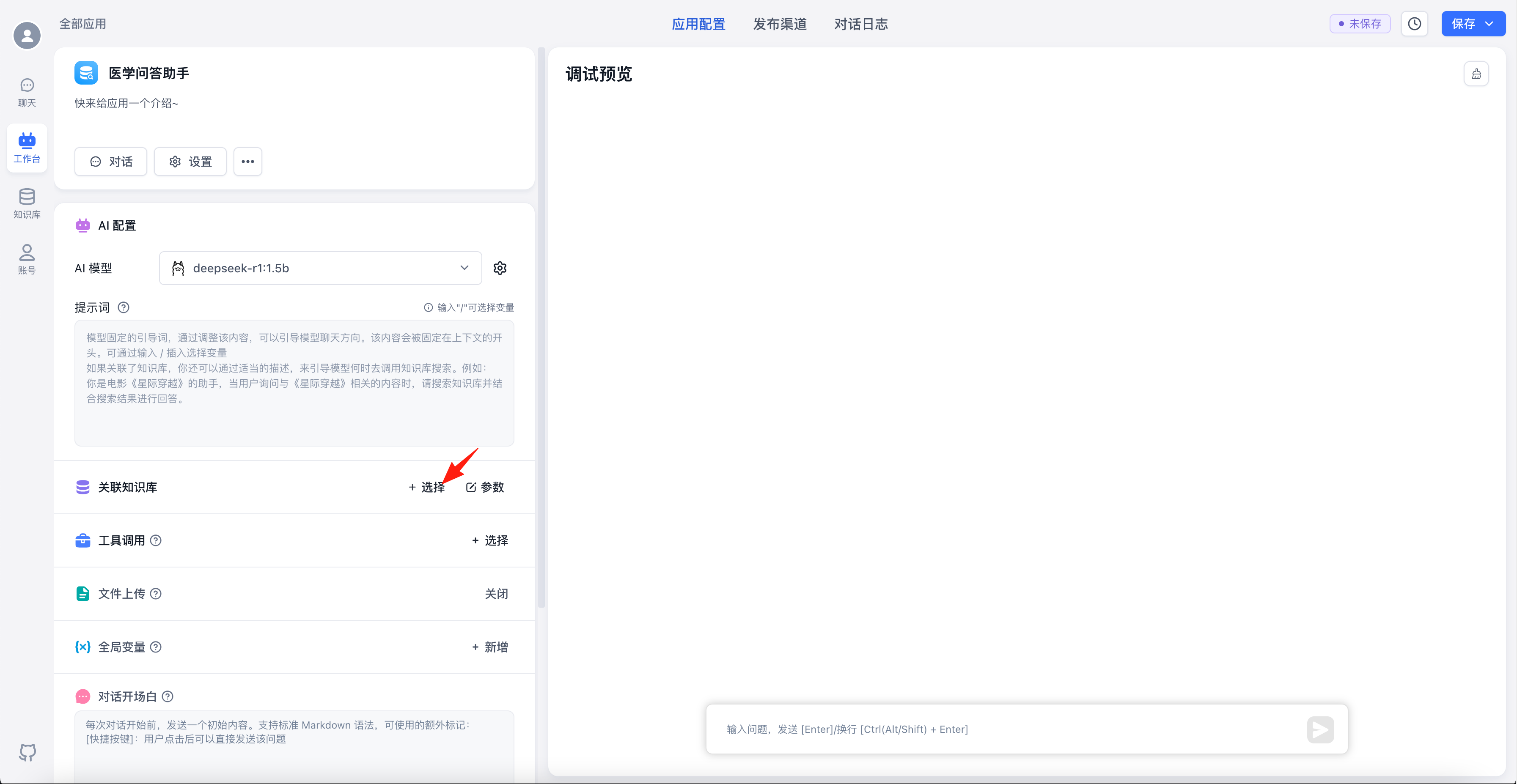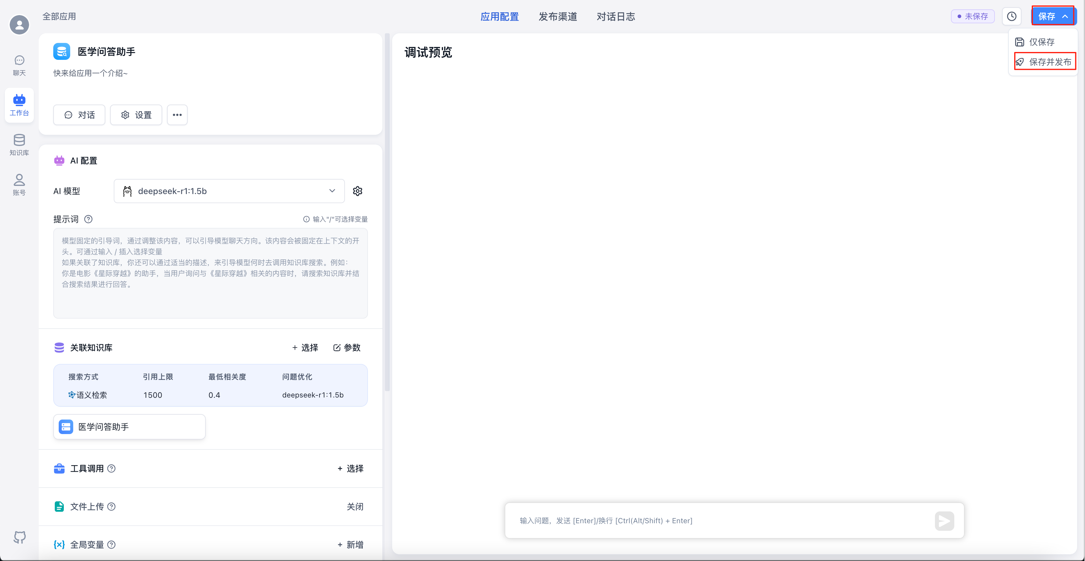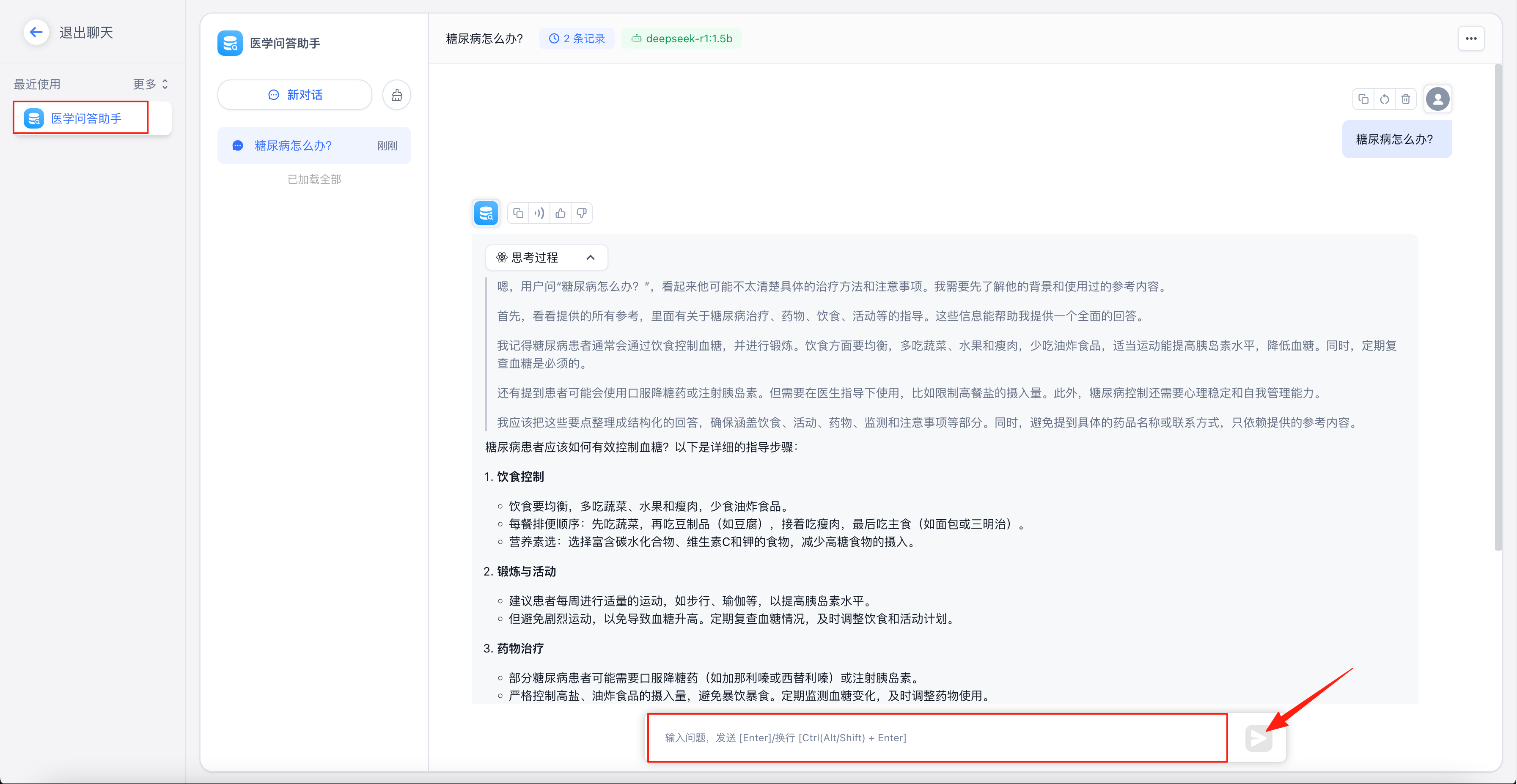 左侧选中刚创建的问答助手,输入问题,点击发送即可。