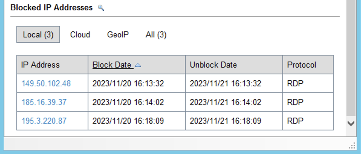 通过Windows自带的mstsc或其他远程桌面工具连接服务器,然后故意输错三次以上密码,最后查看RdpGuard窗口下方的“Blocked IP Addressss”中是否出现了你的公网出口IP,包括IP地址信息、被封禁时间、解除封禁时间和协议信息