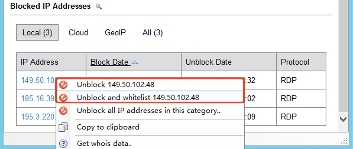 如果发现有IP被误封,或者确认登录IP是安全的,可以在RdpGuard窗口下方的“Blocked IP Addressss”中找到对应的IP,对IP右键单击,选择解封或者解封并加白操作。