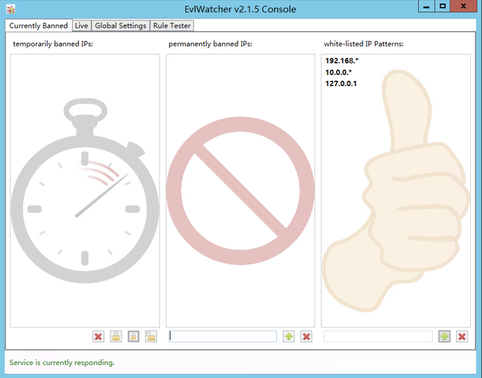 Currently Banned”选项卡可以看到有三个IP列表,从左往右分别是“临时封禁IP清单”、“永久封禁IP清单”和“白名单IP清单”