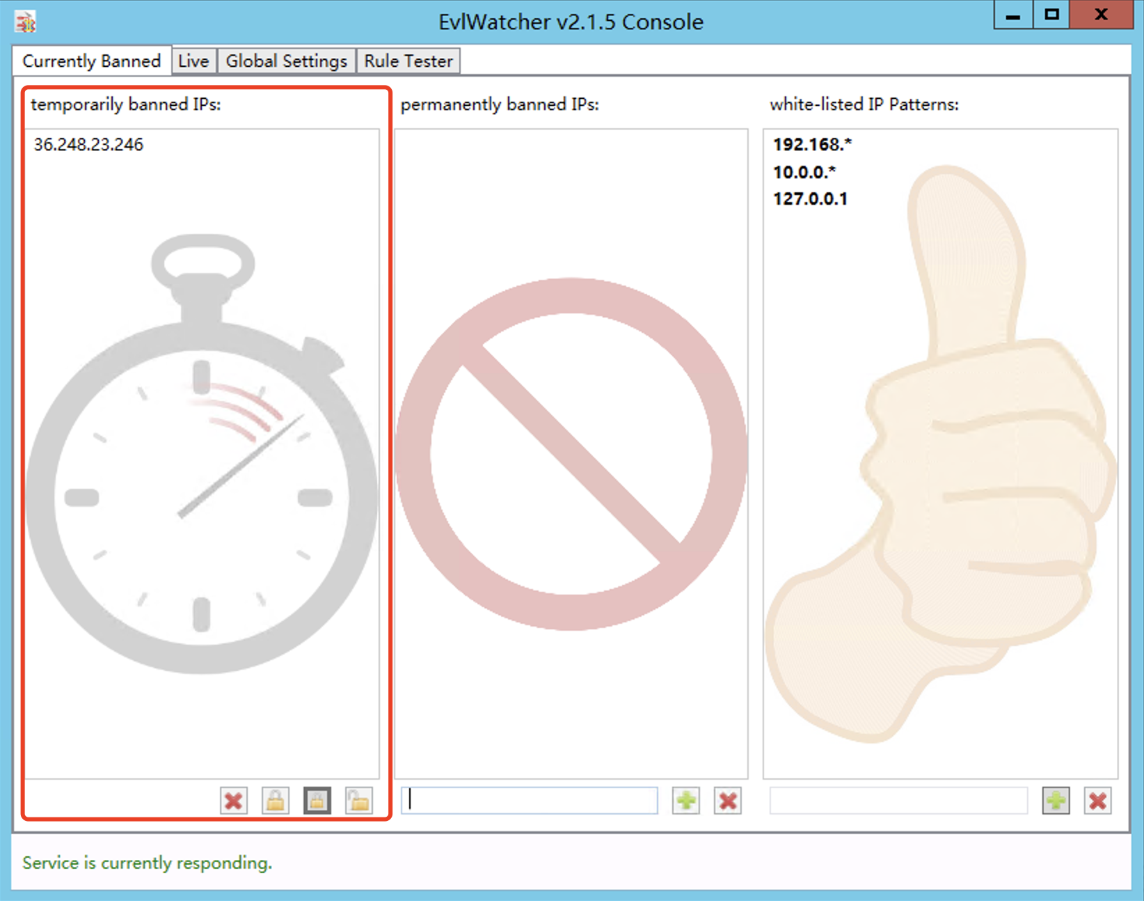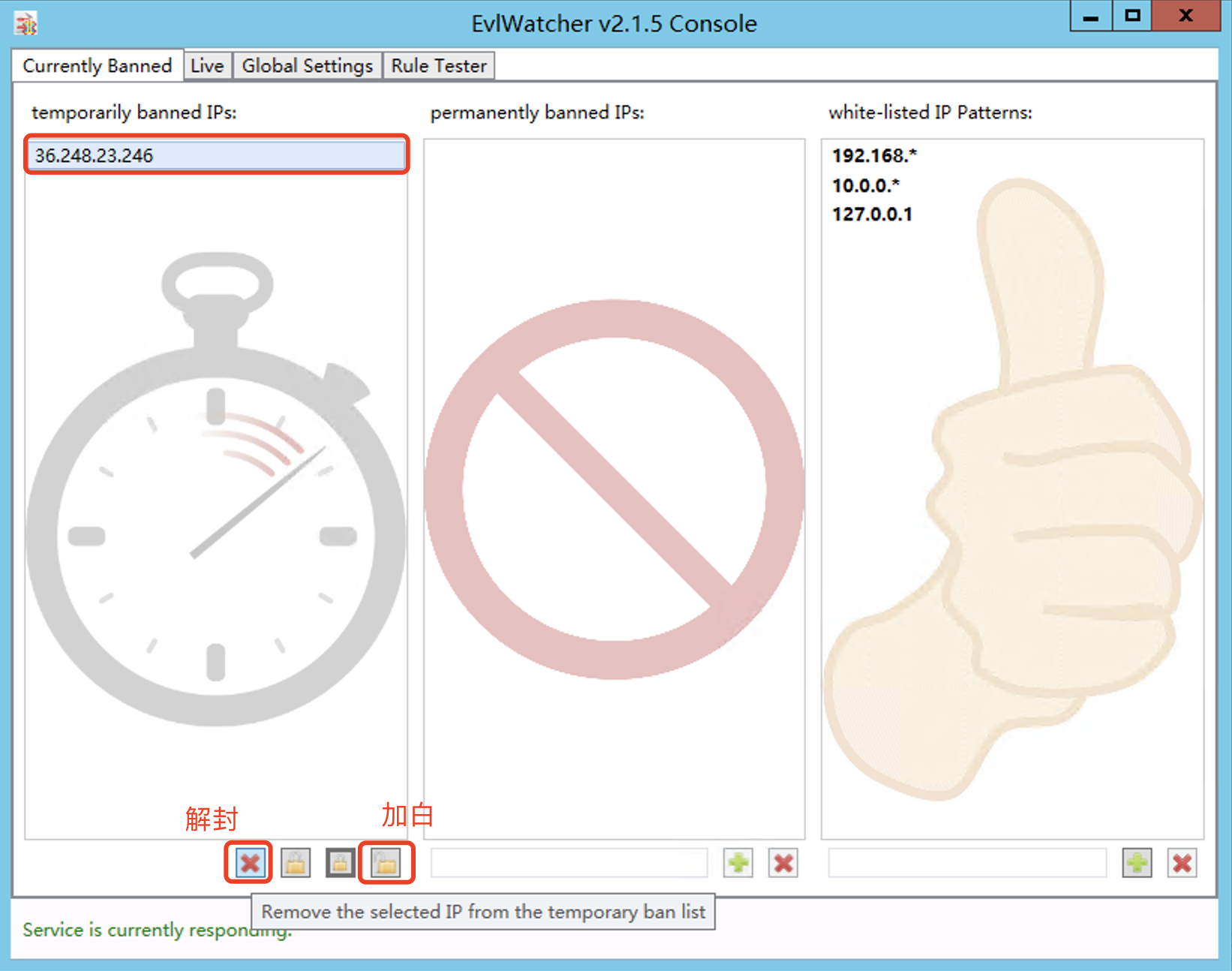 如果发现有IP被误封,或者确认登录IP是安全的,可以在EvlWatcher窗口的“temporarily banned IPs”中选中对应的IP,单击下方的解封或者加白按钮。