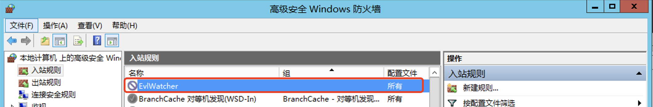 如果出现“temporarily banned IPs”中显示IP已封禁,但客户端仍然可以连接服务器的情况,请检查下Windows防火墙是否开启。因为EvlWatcher是通过自动配置Windows防火墙规则实现IP封禁,如果Windows防火墙未开启的话将导致防火墙规则无法生效。EvlWatcher对应的防火墙规则配置如下图,当封禁IP为空时会自动禁用此规则