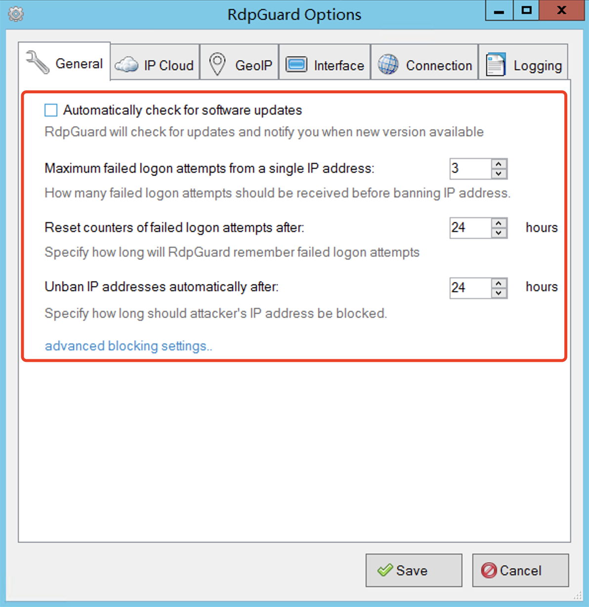 General”选项卡可以设置是否自动检查软件更新、在几次连接不成功之后就禁止对方连接、指定RdpGuard记住失败登录尝试的时间、指定攻击者的IP地址应该被阻塞多久等等
