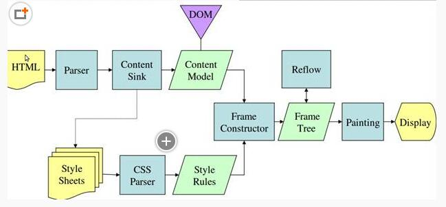 从图1和图2中可以看出,尽管Webkit和Geoko使用的术语稍有不同,他们的主要流程基本相同。Geoko称可见的格式化元素组成的树为frame树,每个元素都是一个frame,Webkit则使用render树这个名词来命名由渲染对象组成的树。Webkit中元素的定位称为布局,而Geoko中称为回流。Webkit称利用DOM节点及样式信息去构建render树的过程为attachment,Geoko在HTML和DOM树之间附加了一层,这层称为内容接收器,相当于制造DOM元素工厂。